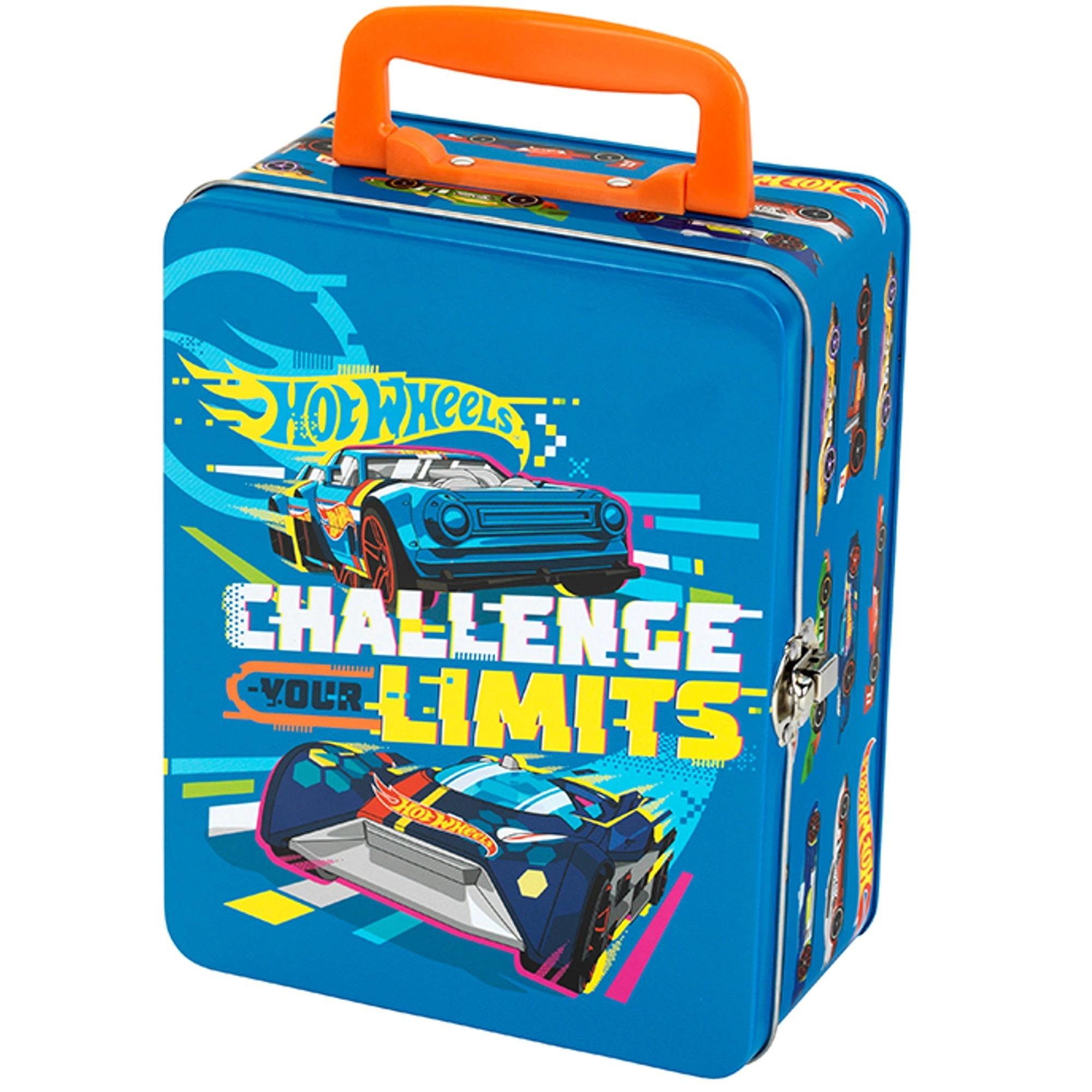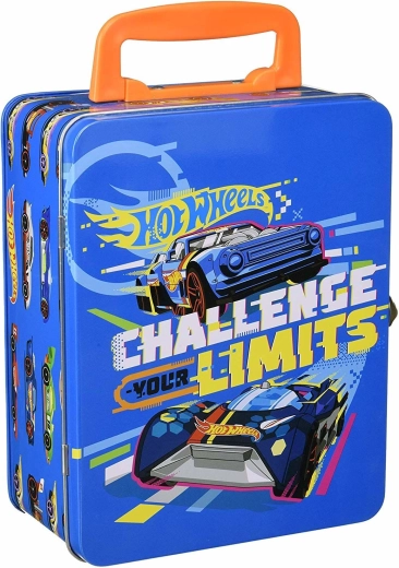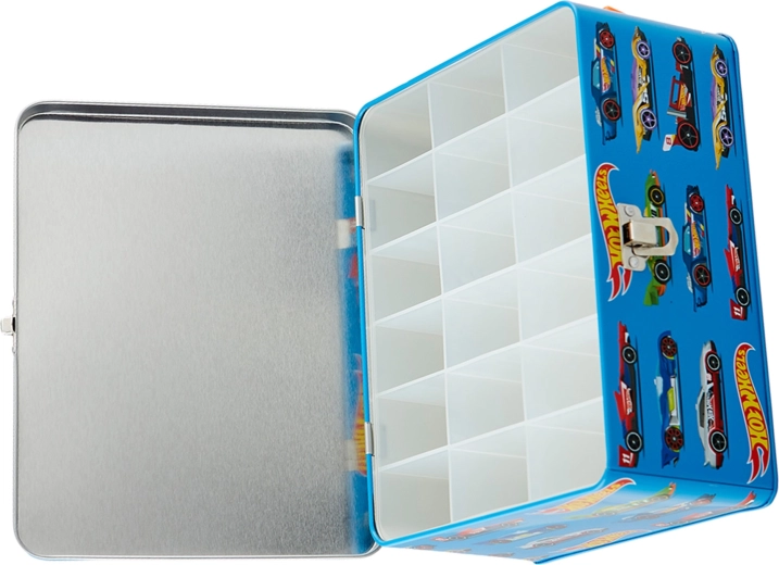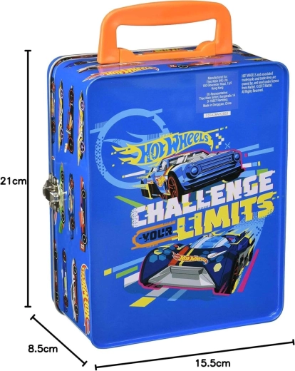 Този стилен син куфар с графики на състезателни автомобили и слогана „Challenge Your Limits“ е страхотно решение за всички малки колекционери. Вътре ще откриете изваждаща се решетка с 18 отделни отделения, които поддържат количките подредени и защитени. Здравата метална конструкция и надеждното катарамово закопчаване осигуряват безопасно съхранение при пренасяне.