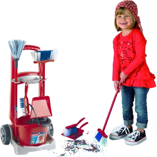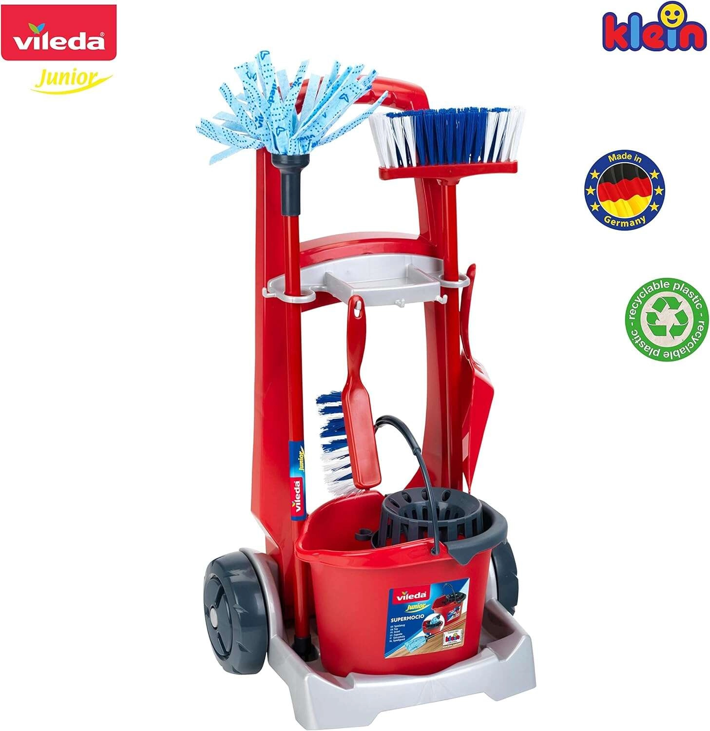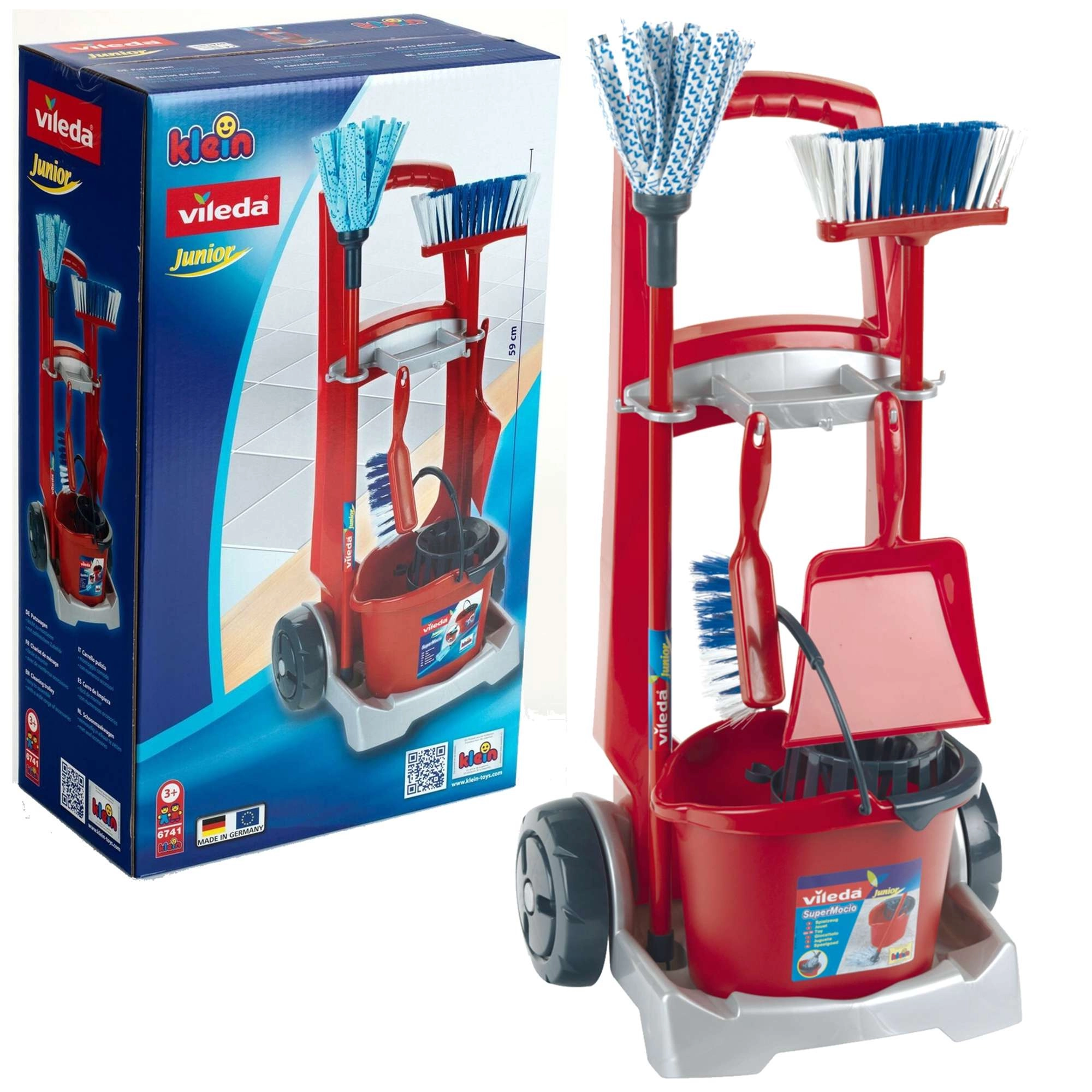 Детската почистваща количка Vileda от марката Klein е богато оборудван комплект за реалистична игра на домакинство. Включва количка на колелца, кофа с изстискващ кош, моп, метла, ръчна четка и лопатка. Подпомага ролева игра, учи децата на ред и отговорност и благодарение на здравата изработка гарантира дълъг живот.