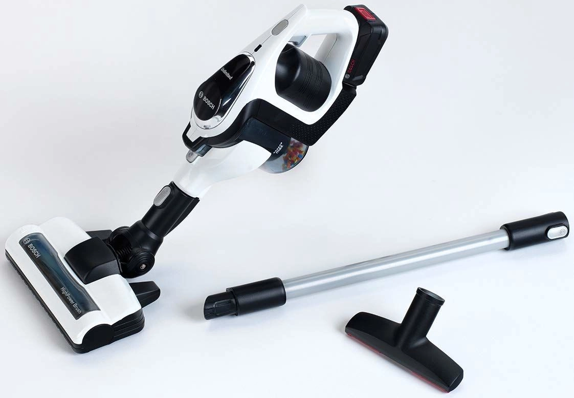 Детската пръчкова прахосмукачка BOSCH Unlimited от марката Klein е реалистична играчка за малки помощници у дома. Предлага LED светлина, въртящи се топчета в контейнера, два сменяеми накрайника и възможност лесно да се превърне в ръчна прахосмукачка. Леката и безопасна конструкция е идеална за деца от 3 години и подкрепя имитирането на възрастните и развитието на моториката.