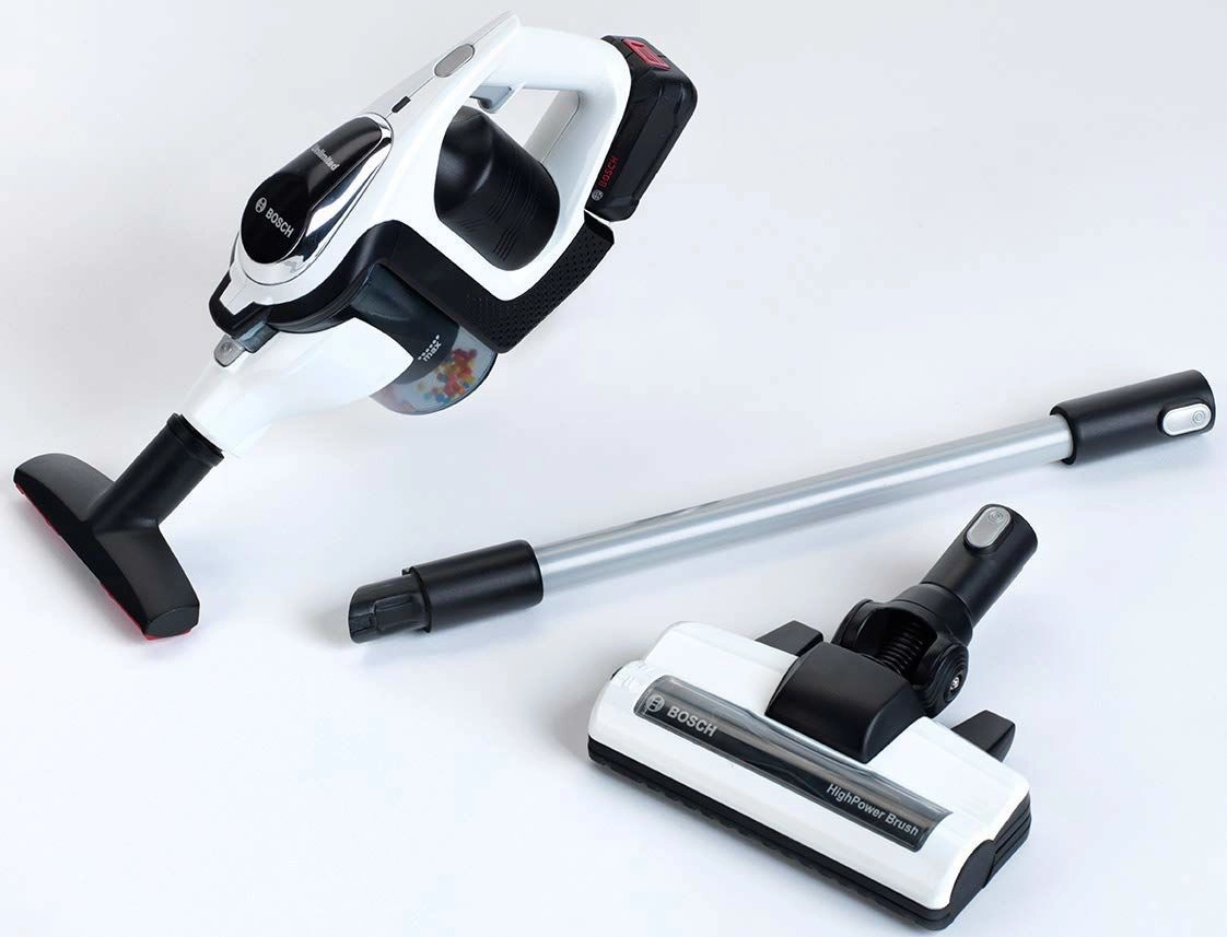 Автентичната детска прахосмукачка BOSCH Unlimited в бяло‑черно изпълнение със сребърна тръба достоверно наподобява истински уред. Благодарение на LED осветлението и въртящите се топчета в прозрачния контейнер изглежда много реалистично при „прахосмукиране“, като остава напълно безопасна за игра.