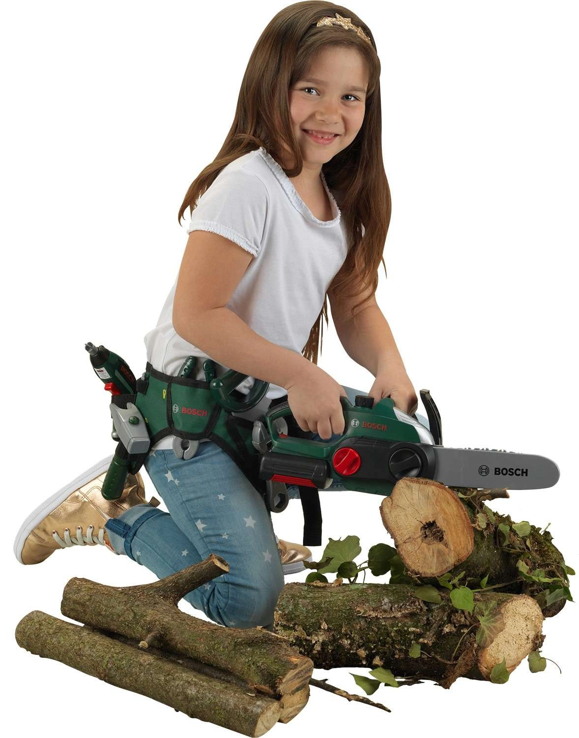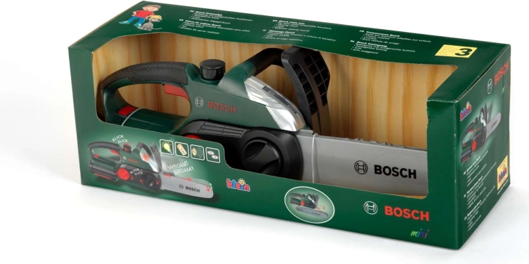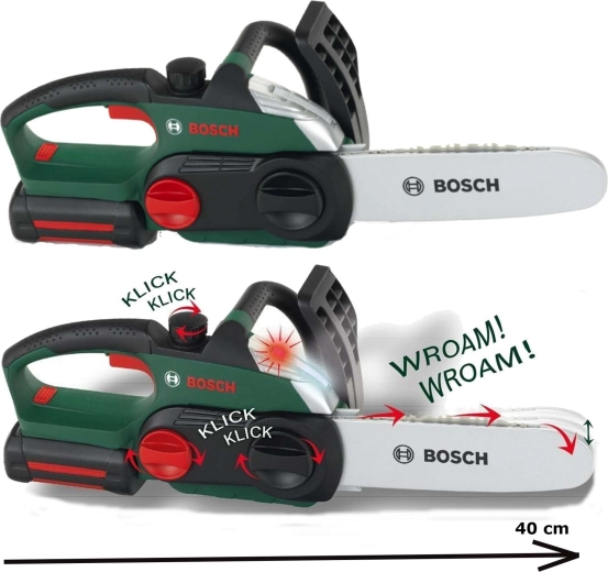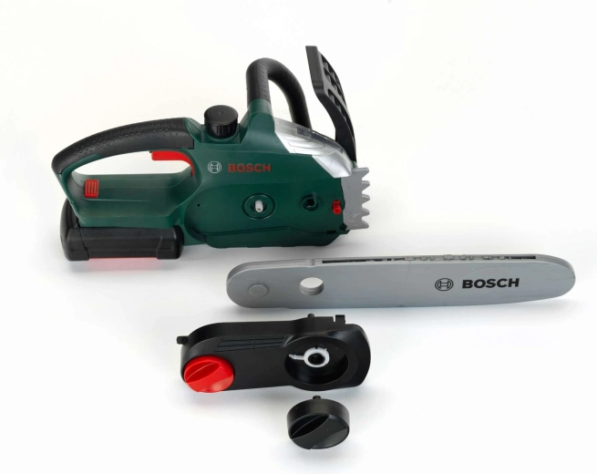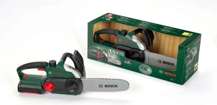 Тази детска безжична верижна резачка достоверно наподобява истинския инструмент BOSCH – включително тъмнозеленото изпълнение с червени и сребърни елементи. Изработена е здраво и с внимание към детайла, за да се радват децата на автентична игра на дървар или градинар в пълна безопасност.
