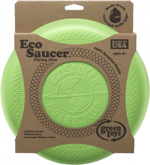 GREEN TOYS поставя акцент върху устойчивостта и безопасността. EcoSaucer е произведен от рециклирана пластмаса от бутилки за мляко, не съдържа вредни вещества, а опаковката му е 100% рециклируема. Благодарение на гладкия и здрав материал лежи удобно в ръката и се почиства лесно – спокойно го поставете в миялната.