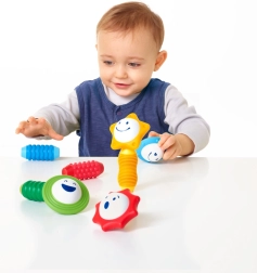Комплектът помага на децата да развиват сетивното възприятие чрез разпознаване на форми, цветове и текстури.