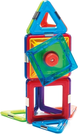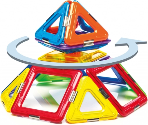 Комплектът съдържа общо 6 магнитни квадрата, 8 триъгълника и 1 спинър, което предлага широки възможности за експериментиране. Този комплект е не само забавен, но и образователен, като развива детските умения като пространствено въображение, координация, концентрация и креативност.