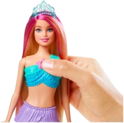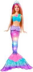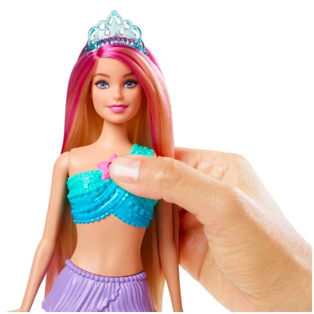 Открийте вълшебния свят на фантазията с куклата BARBIE Dreamtopia – русалка със светеща опашка. Достатъчно е да я потопите във вода и опашката ще засияе в 4 светлинни режима, или натиснете бутона във форма на звезда на корсета и се насладете на светлинките и без вода. Цветните дъгови перки, розовите кичури коса и блестящата тиара създават очарователна визия, която ще впечатли всяко дете от 3 години нагоре.