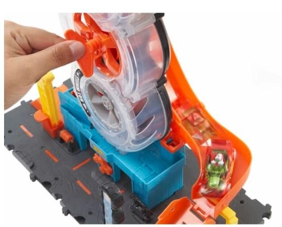 Този игрови комплект е напълно съвместим с други сетове Hot Wheels, което позволява на децата да създадат свой собствен свят от състезания и акробатични изпълнения. Една кола е включена в комплекта, като до четири автомобила могат да се въртят едновременно в структурата с гуми, което гарантира безкрайно забавление.