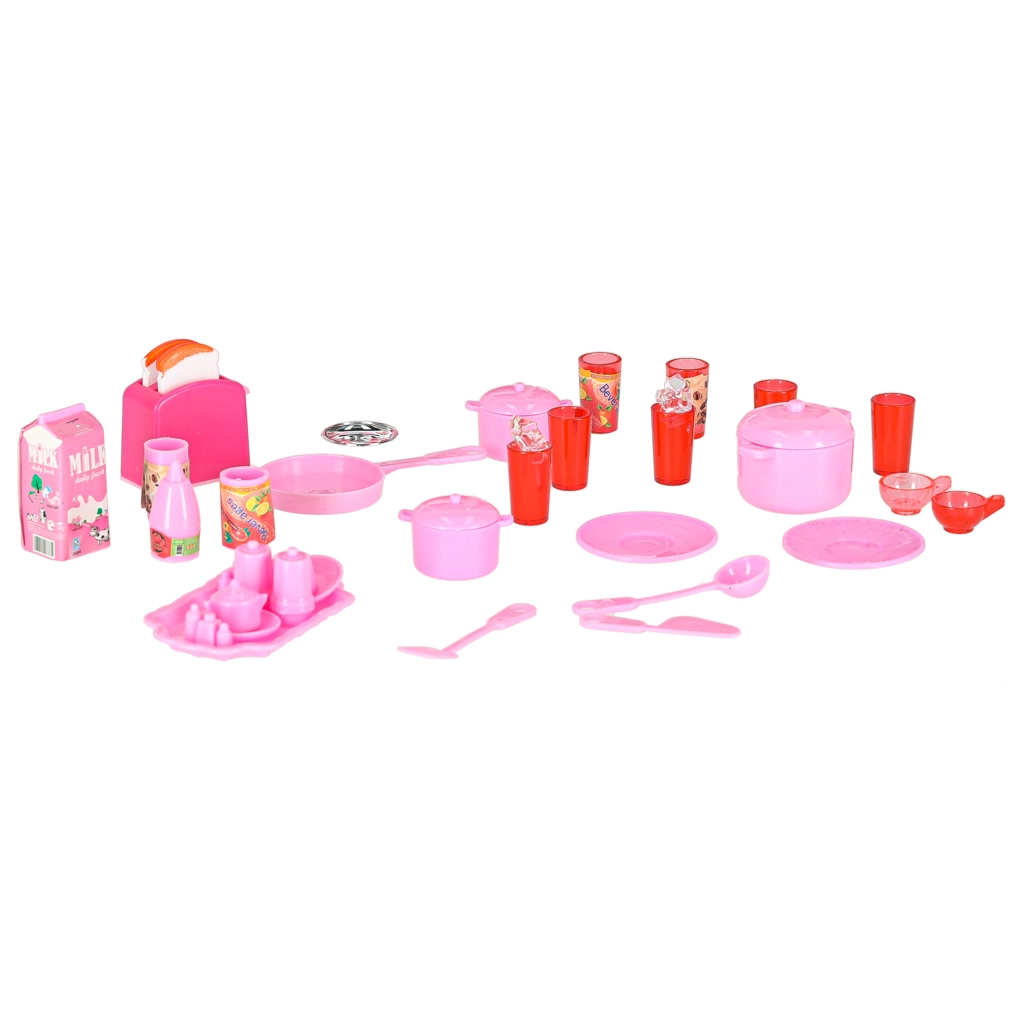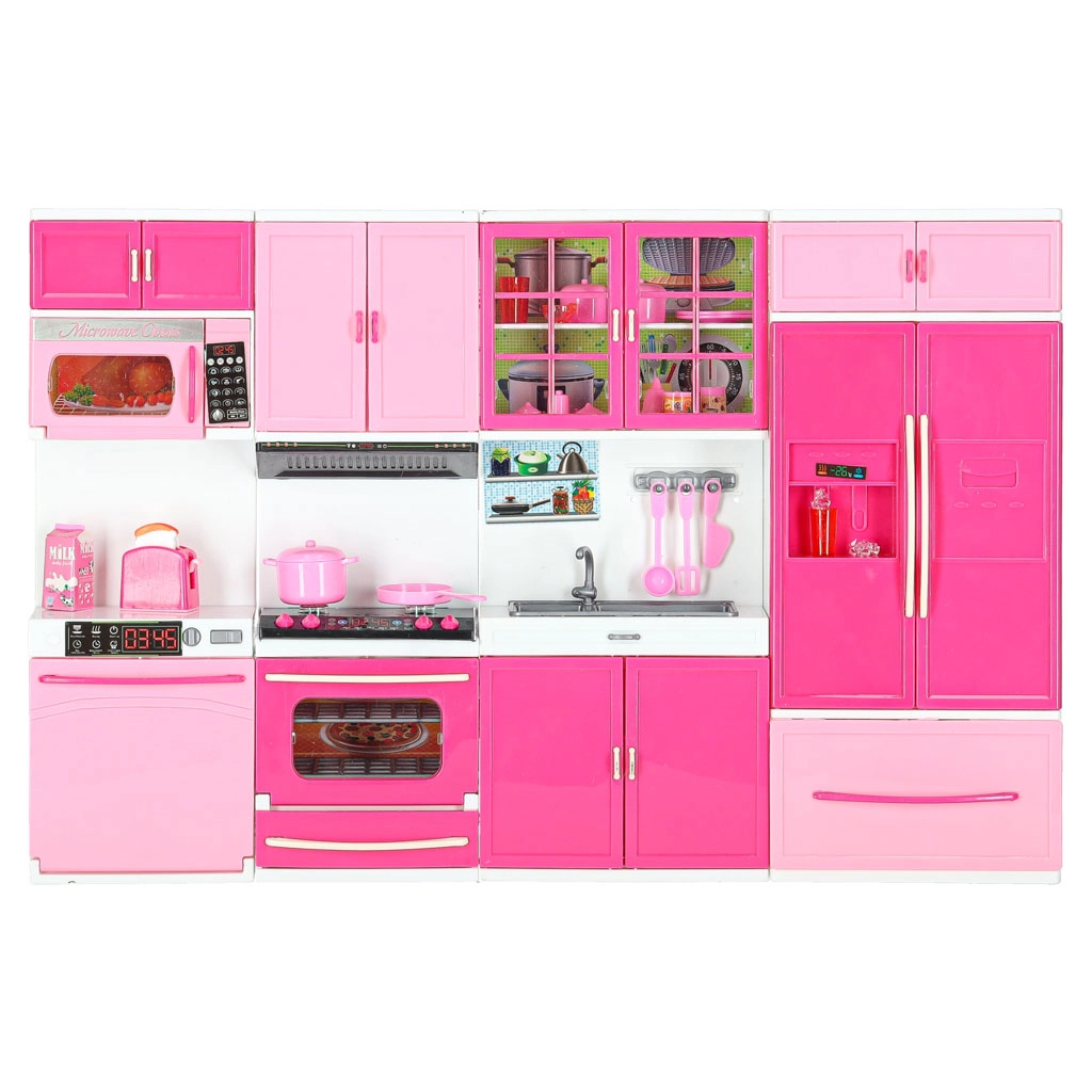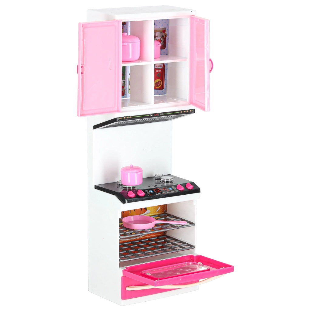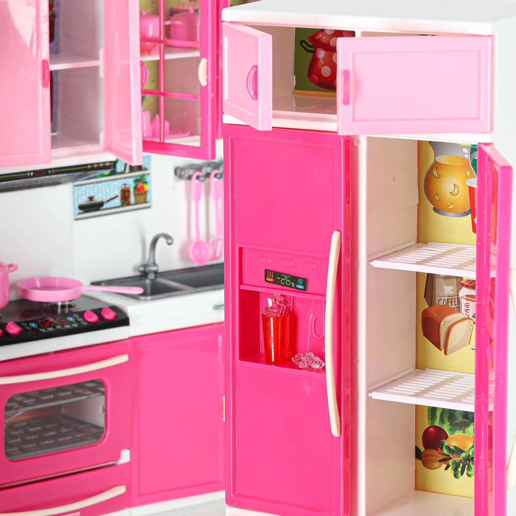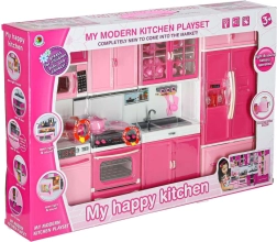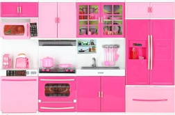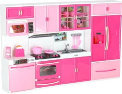 В комплекта има богати аксесоари: тенджери с капаци, тиган, тостер с подвижен лост, съдове, чаши, кутийки, „кутия мляко“, кухненски принадлежности на куки и „кубчета лед“. Отваряемите шкафчета, изтеглящото се чекмедже и рафтовете учат децата на ред, развиват фината моторика и социалните умения.