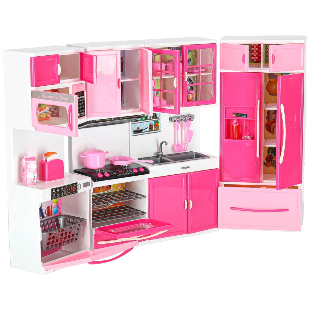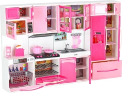 Тази модерна кухничка за кукли въвежда децата в свят на фантазия и имитация на ежедневни дейности. Четирите свързани сегмента позволяват да се подреди цялостна кухня с всички важни елементи – от котлони с фурна до хладилник и мивка. LED подсветените котлони и звуците придават на играта по готвене реалистичен облик.
