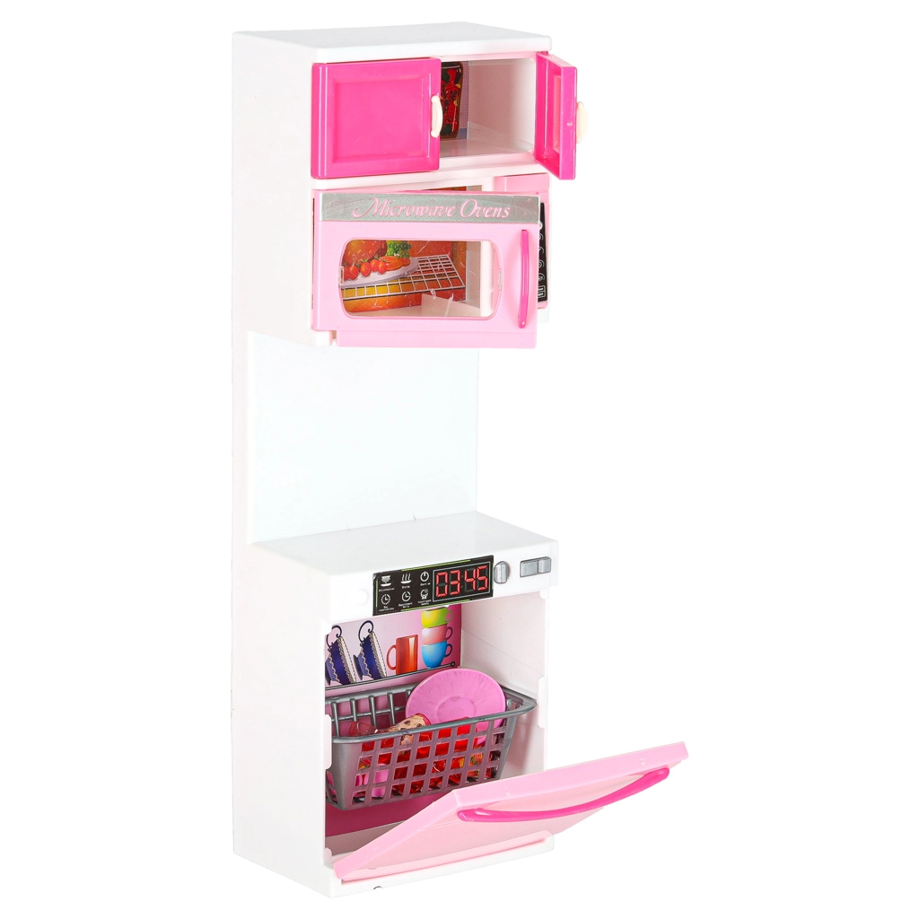Комплектът включва микровълнова печка и съдомиялна, котлони с фурна, витрина с мивка и хладилник с чекмедже. Децата ще се насладят на пълен сценарий на готвене, печене и почистване.