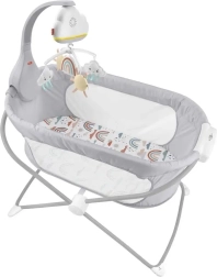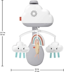 Fisher-Price Бебешки мобил е успокояващ музикален мобил с пухкави играчки във формата на облачета и слънца, който помага на децата да заспиват и да се отпускат.