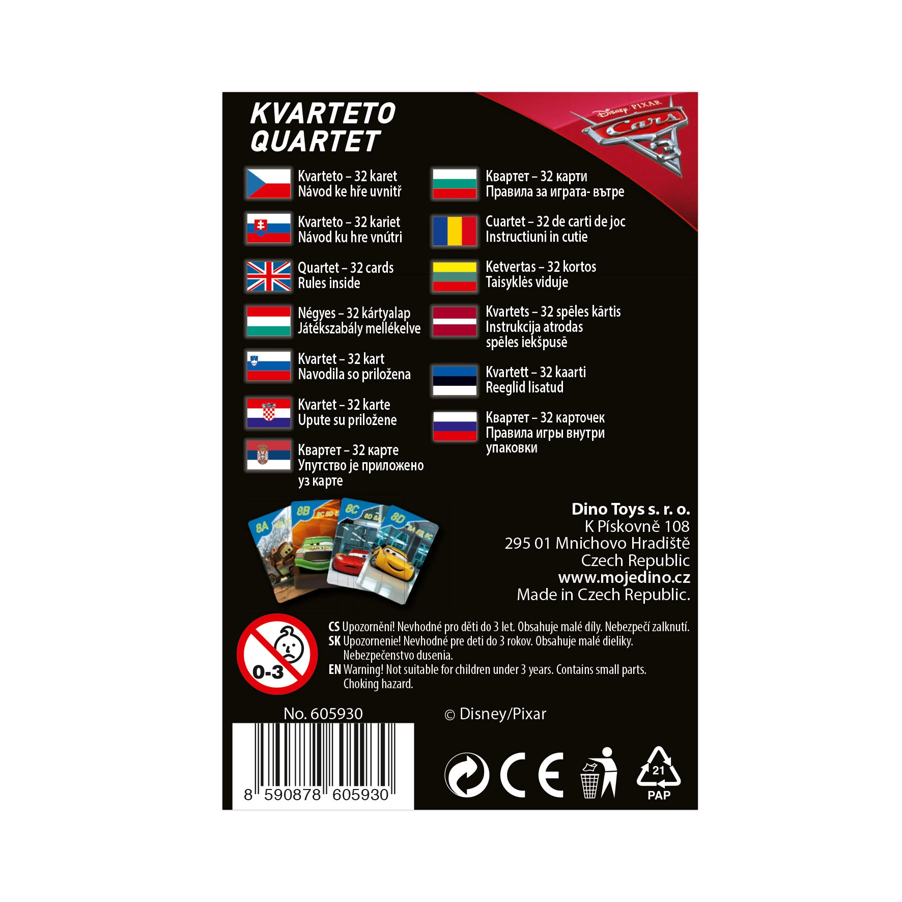 Влезте в света на количките с игралните карти Cars 3 Quarteto, където се състезават Светкавицата Маккуин, Мате и Крус Рамирес. Тази картова игра е идеална за 3 до 6 деца, които искат да се забавляват заедно. Основната цел на играта е да съберете възможно най-много четворки карти със същия символ.