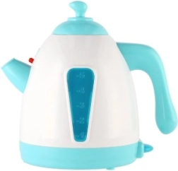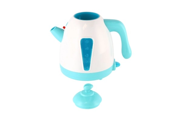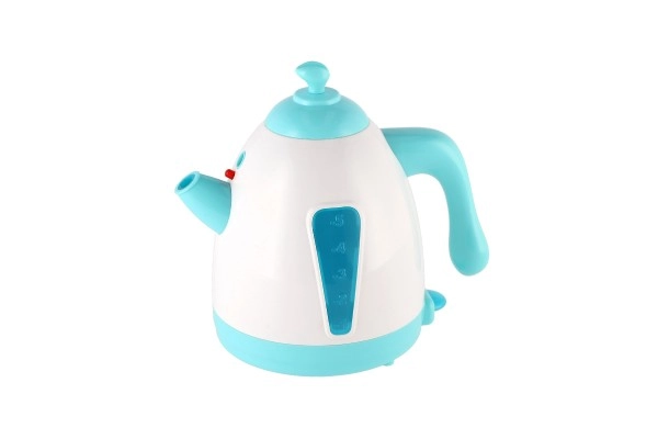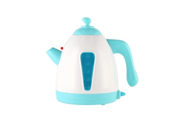 Чайникът е проектиран като истински кухненски уред с елегантна бяла и тюркоазена цветова комбинация.