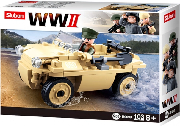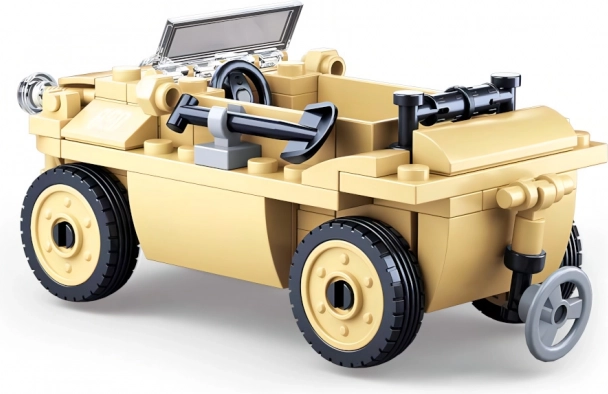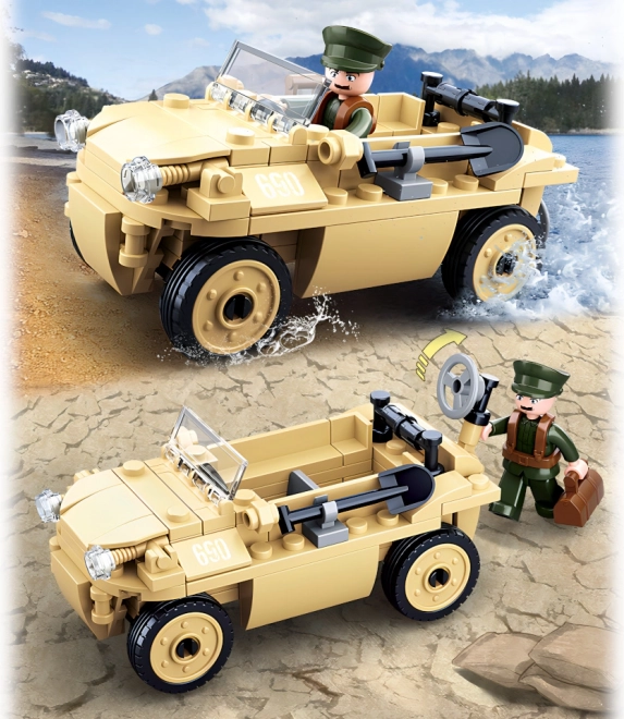 Конструкторът предлага детайлна реплика на немско амфибийно превозно средство, обогатена с реалистични елементи като предно стъкло и подвижни колела.