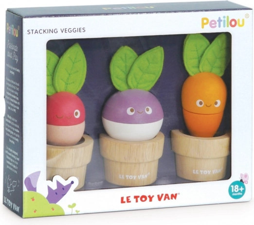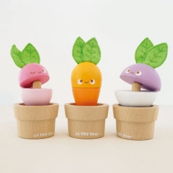 Очарователният комплект дървени саксии със зеленчуци от LE TOY VAN подпомага фината моторика, координацията око–ръка и въображението. Децата могат да смесват и сглобяват отделните части в морков, репичка и цвекло или да създават свои комбинации. Играчката е изработена от устойчива дървесина, има филцови листенца и е ръчно дооцветена с нетоксични бои на водна основа.
