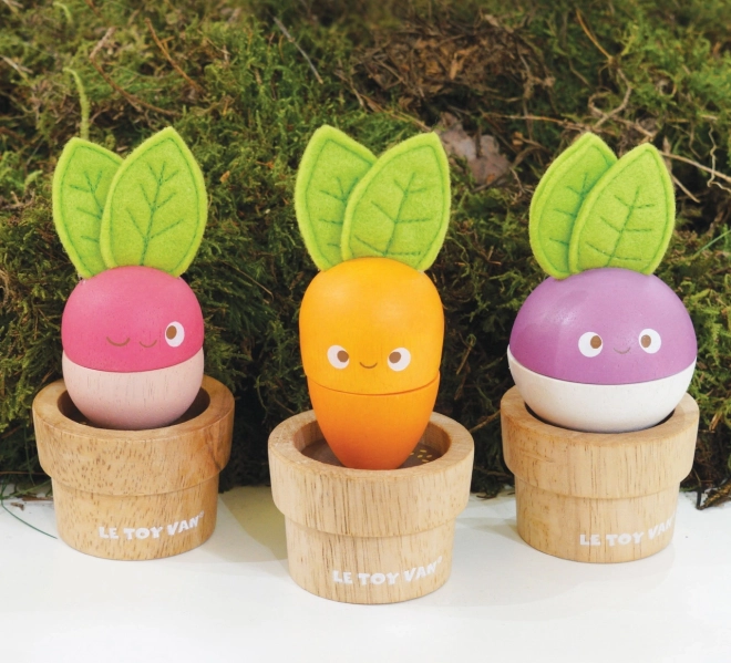 - 3 очарователни зеленчука: морков, репичка, цвекло – всеки в дървена саксия