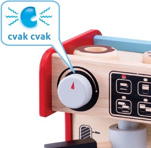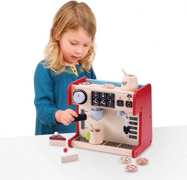 С тази кафемашина децата могат да изпробват какво е да бъдеш бариста. Комплектът включва кафемашина с подвижна ръчка и подвижен дозатор за мляко. Всичко е допълнено с контролен дисплей с въртящ се щракащ бутон и изрисувани бутони.