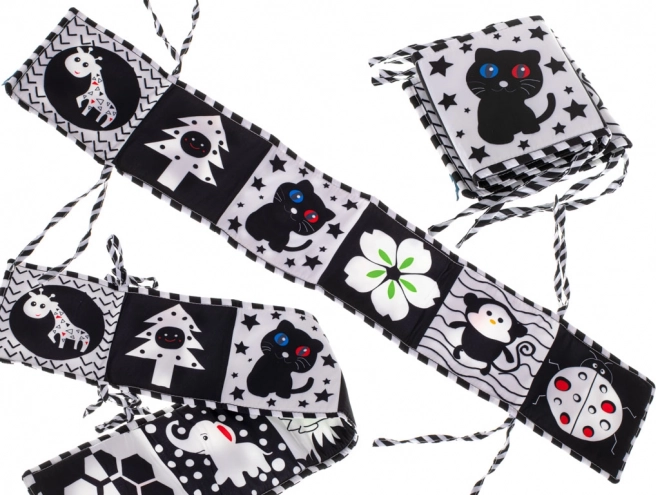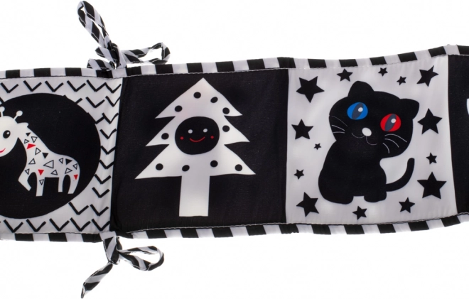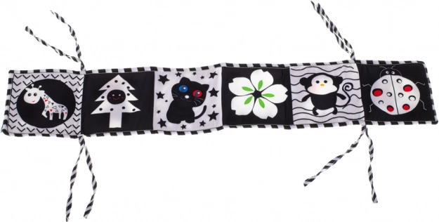 Контрастната сензомоторна книжка, проектирана като предпазна лента за кошара, е перфектен избор за деца, които започват да откриват света. Книжката тип хармоника може лесно да се прикрепи към кошарата с помощта на връвчици, което носи не само забавление, но и безопасност.