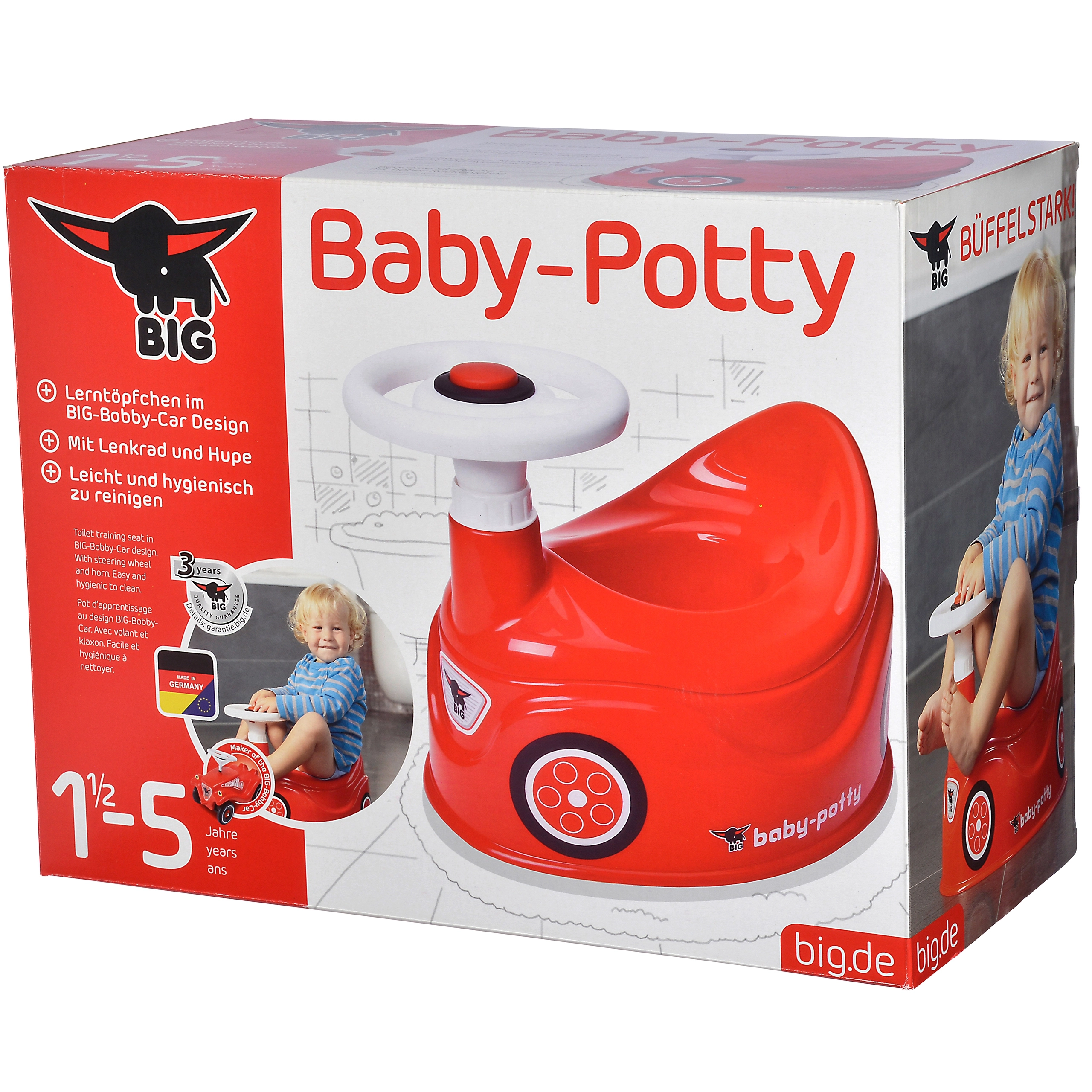 Превърнете първите стъпки към гърненцето в забавление! Детското гърненце BIG New Bobby Car изглежда като истинска червена количка с волан и клаксон, има висока облегалка, интегрирана защита срещу пръски и подвижна вътрешна чашка за лесно почистване. Изработено е от качествени, безопасни материали, които се поддържат лесно.