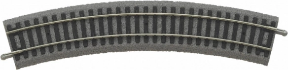 Извита релса от марката PIKO с детайлна репродукция на дървени траверси върху баластова основа. Идеална за моделисти, търсещи реалистична изработка и високо качество.
