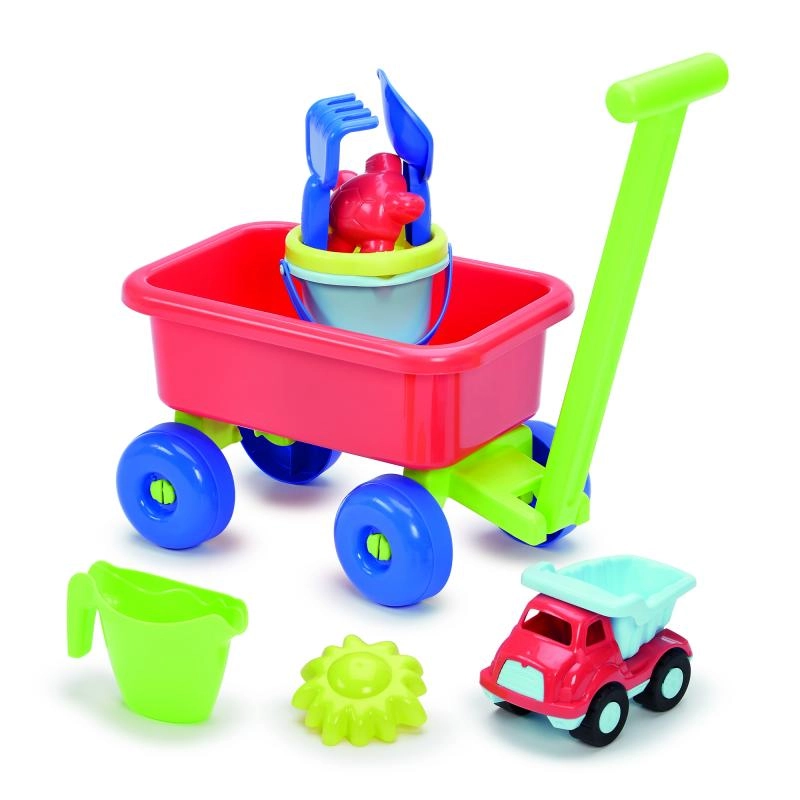 Този пъстър комплект за пясък предлага всичко, от което децата се нуждаят за творческа игра в пясъчника или край водата. Леката количка с дълга дръжка и стабилни колела лесно превозва кофичката, лейката и останалите аксесоари. Издръжливата пластмаса и безопасните форми осигуряват удобно и безгрижно забавление – независимо дали строите пясъчен замък или превозвате товар със самосвалчето.