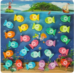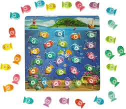 Присъединете се към вълшебния подводен свят и изживейте безкрайно забавление с дървената игра за ловене на рибки. Тази образователна игра помага на децата да научат буквите, цветовете и броенето. Рибките, обозначени с отделни букви, трябва да бъдат поставени в правилните отвори и могат да се улавят с помощта на магнитна въдица. Целият процес помага за развитие на концентрация и търпение.