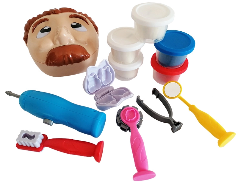 Зъболекарски инструменти (бормашина, клещи, огледалце, четка), форма за зъби, многцветна пластилинова маса