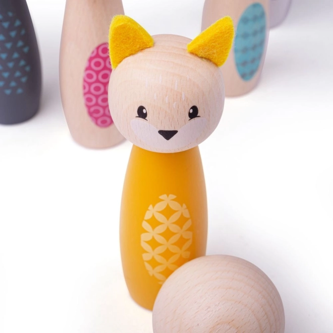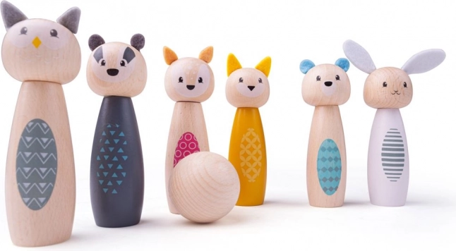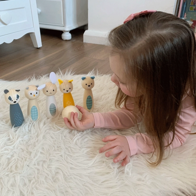 Зарадвайте децата със стилен комплект кегли с миловидни животни – бухал, язовец, елен, котка, мечка и заек. Пъстроцветните фигурки от висококачествено FSC сертифицирано дърво са гладки, приятни на допир и устойчиви на всекидневна игра. Комплектът е подходящ за игра у дома върху килим или на гладък под.