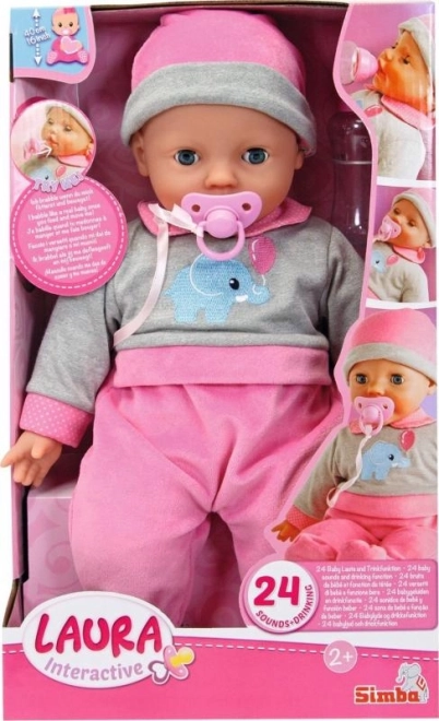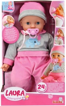 Интерактивната кукла Лаура носи забавление и грижи за децата с меко телце, затварящи се очички и възможност да издава 24 детски звука. В комплекта има шишенце и биберон.