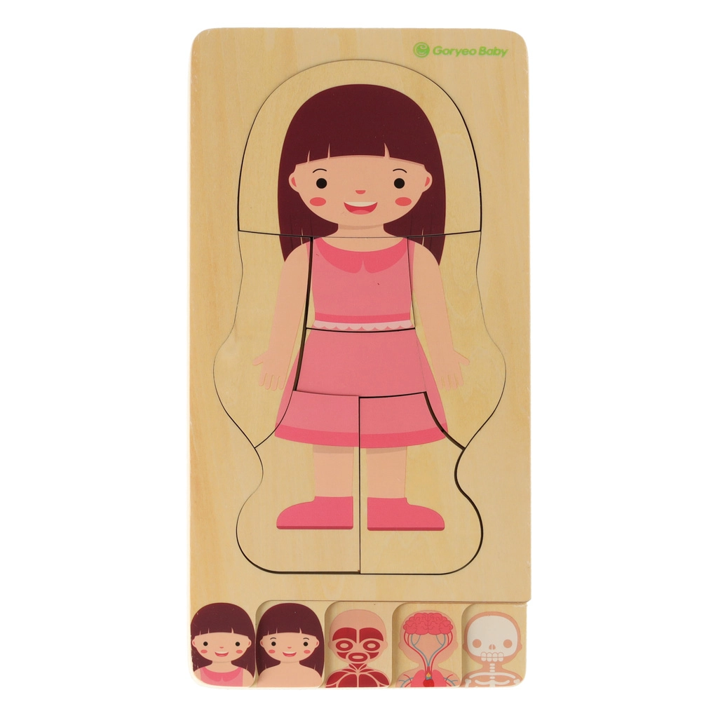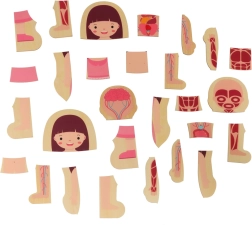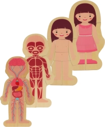 Детето подрежда фигурата от скелета, през органите и мускулите, до тялото и облеклото. Нагледните слоеве подпомагат разбирането на човешкото тяло по игрив начин.