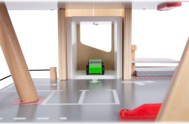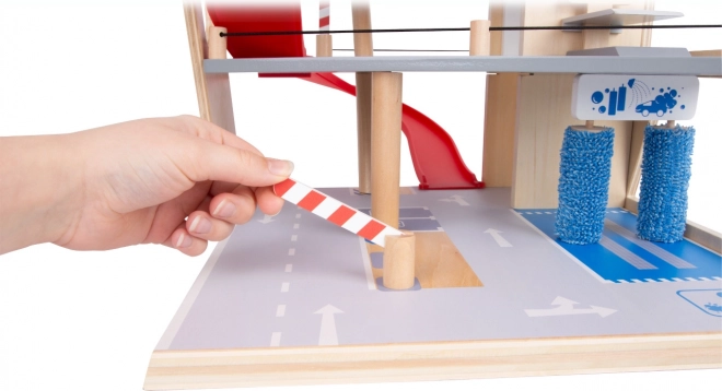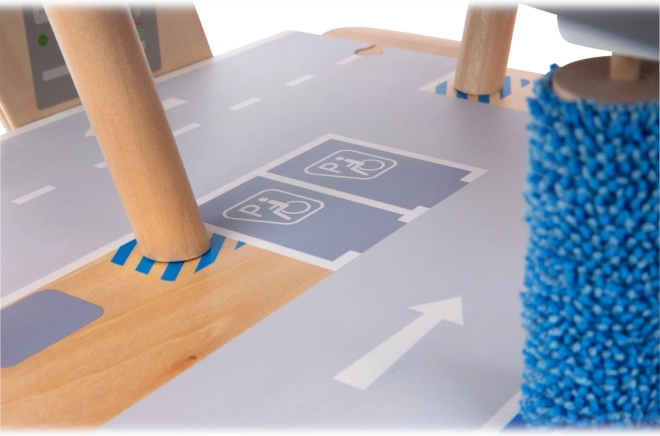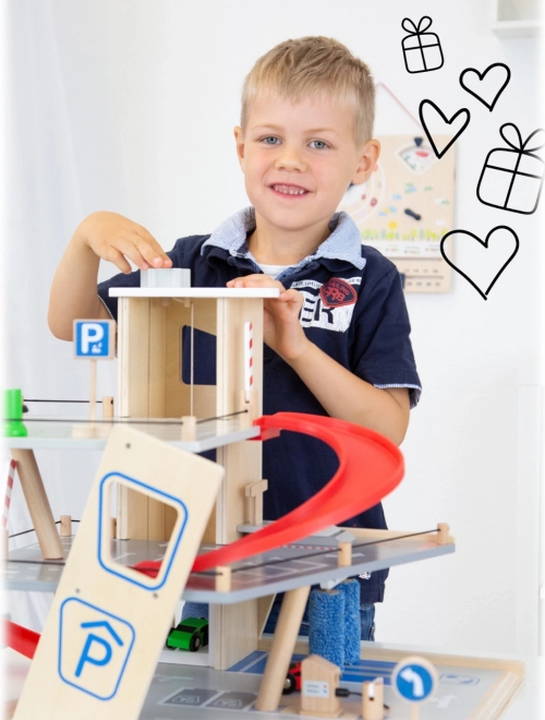 Открийте здрав дървен паркинг с три нива, функционален асансьор и плавни рампи за безкрайни игри с колички. В комплекта има две коли, бензиностанция, зарядна станция за електромобили, повдигаща рампа, реалистична автомивка с четки и механични бариери на всяко ниво. Безопасното шофиране е осигурено от гумени ограничители, а детайлната маркировка развива пътната култура.