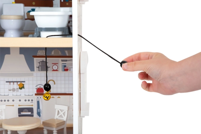Къщата за кукли има светла външна фасада, модерен дизайн и функционални елементи като плъзгащи се врати и отваряеми прозорци.