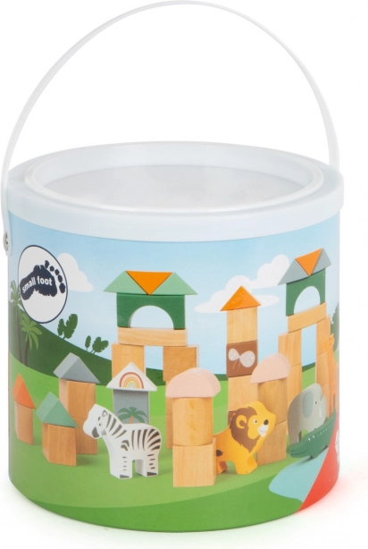 Креативност и забавление за децата с дървените строителни кубчета Сафари! Комплектът включва 50 цветни кубчета и 5 фигурки на животни, които развиват креативността и моторните умения.
