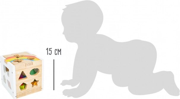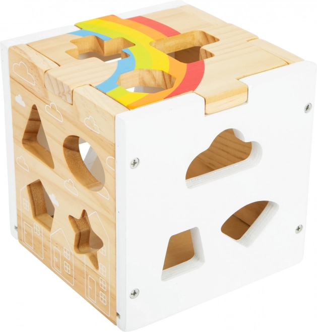 Това модерно дървено сортер кубче SMALL FOOT се отличава с изчистен вид на естествено дърво в комбинация с бели панели и пъстри елементи. Децата поставят във отворите форми като кръг, звезда, триъгълник, кръст, облаче или къщичка, като по игрив начин упражняват фината моторика и логическото мислене.