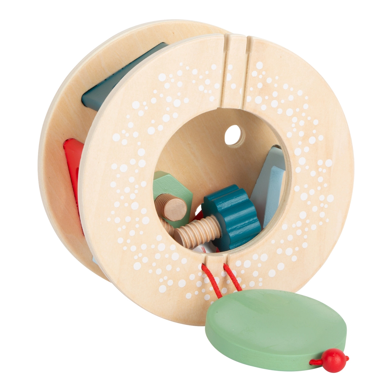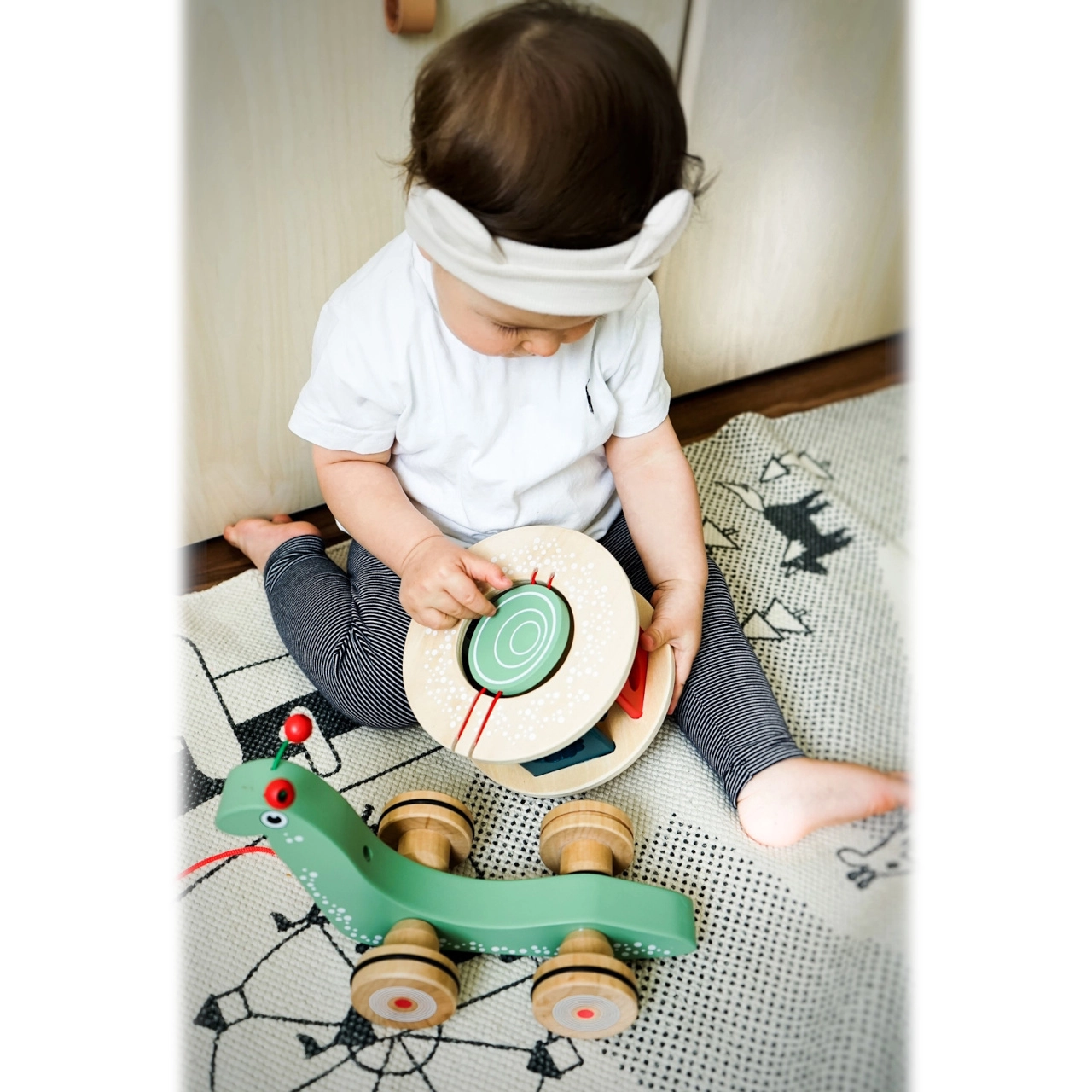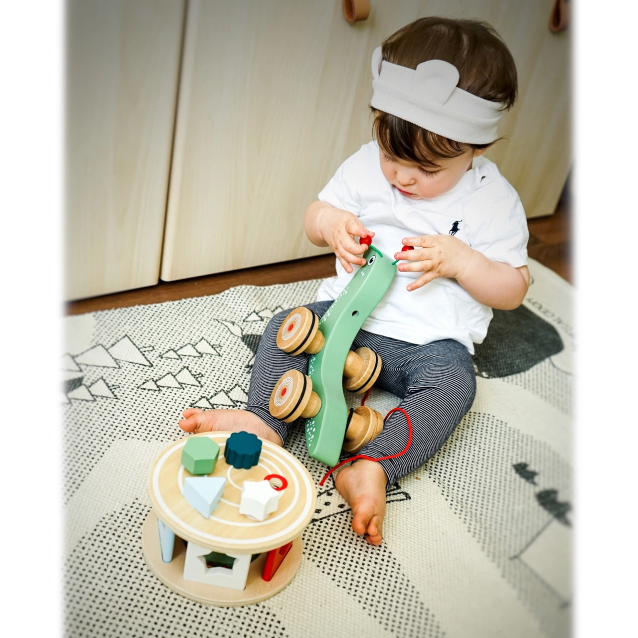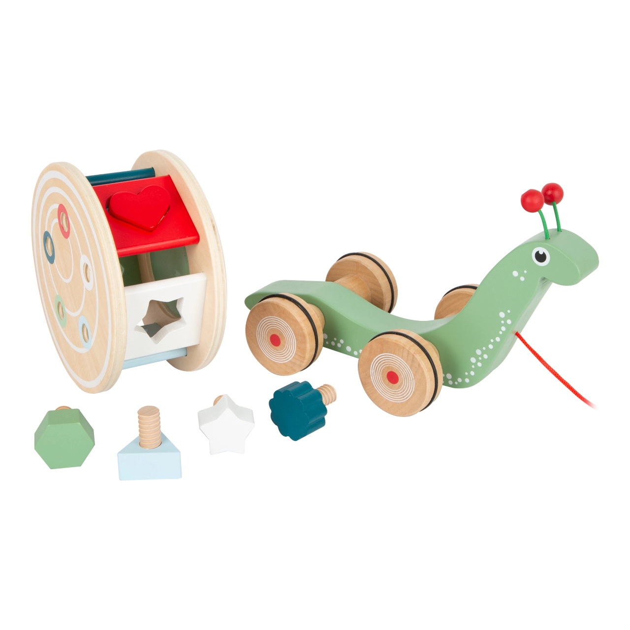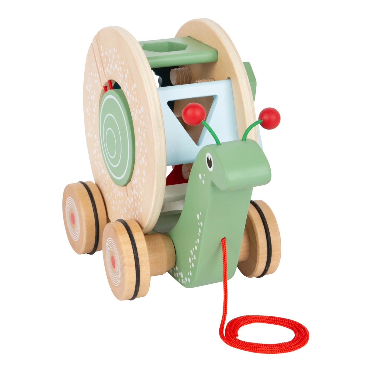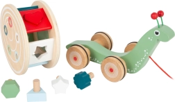Представяме ви очарователно дървено охлювче на връв, което не само забавлява, но и подпомага развитието на вашето дете. Благодарение на своята лекота и лесно въртящи се колелца е идеално за деца, които започват да ходят, като подпомага тяхната координация и баланс. Охлювчето служи и като сортер с пет различни форми, което стимулира когнитивните способности и фината моторика.
