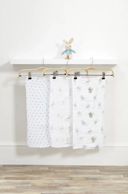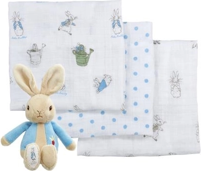 Красивият подаръчен комплект включва 3 бр. муселинови пелени и плюшеното зайче Петър. Пелените са изработени от 100% памук, перат се и всяка има различен принт.
