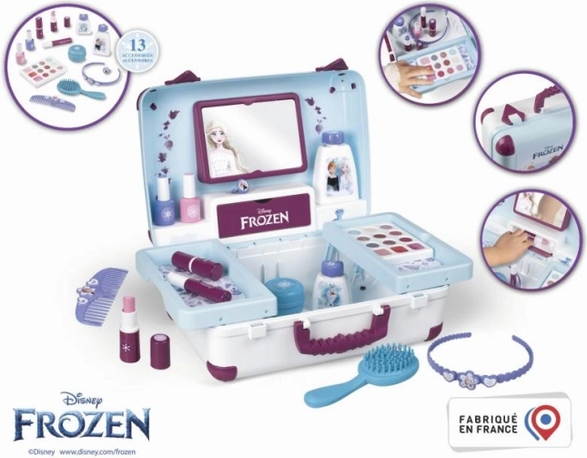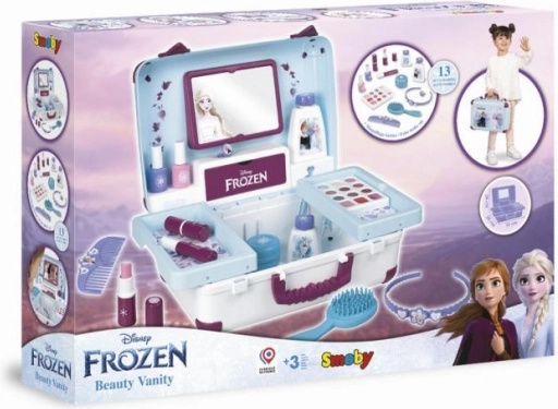 Комплект за красота Smoby Frozen Kraina Ledu е идеалното допълнение за всяко дете, което обича да открива и да имитира възрастните в тяхната ежедневна грижа. Този стилен комплект комбинира три свята – фризьорство, маникюр и грим – и съдържа имитации на истински козметични продукти.
