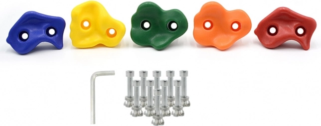 Този комплект съдържа пет здрави и издръжливи хватки за катерене с товароносимост до 100 кг. Идеални за монтаж на модерни детски площадки и външни игрални зони.