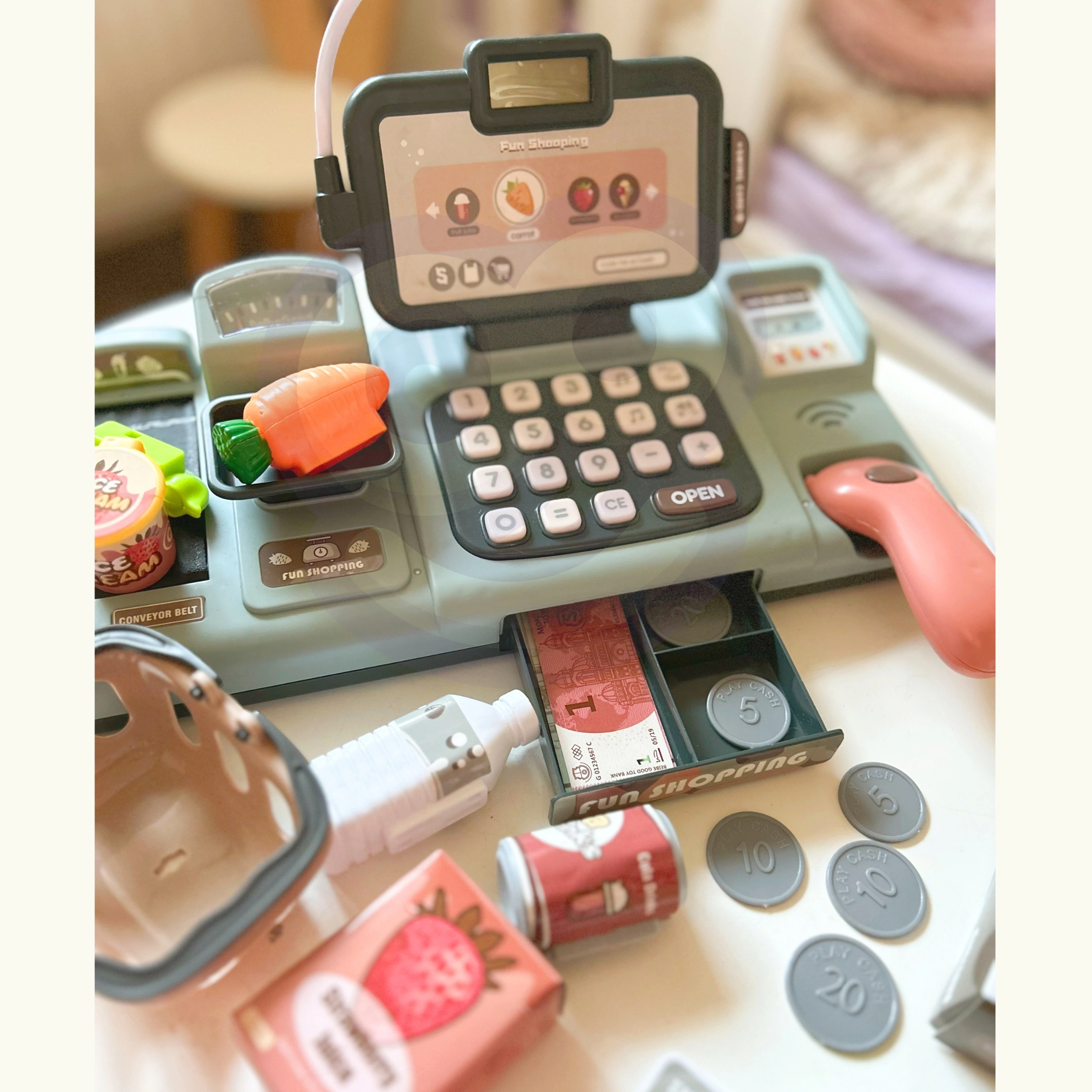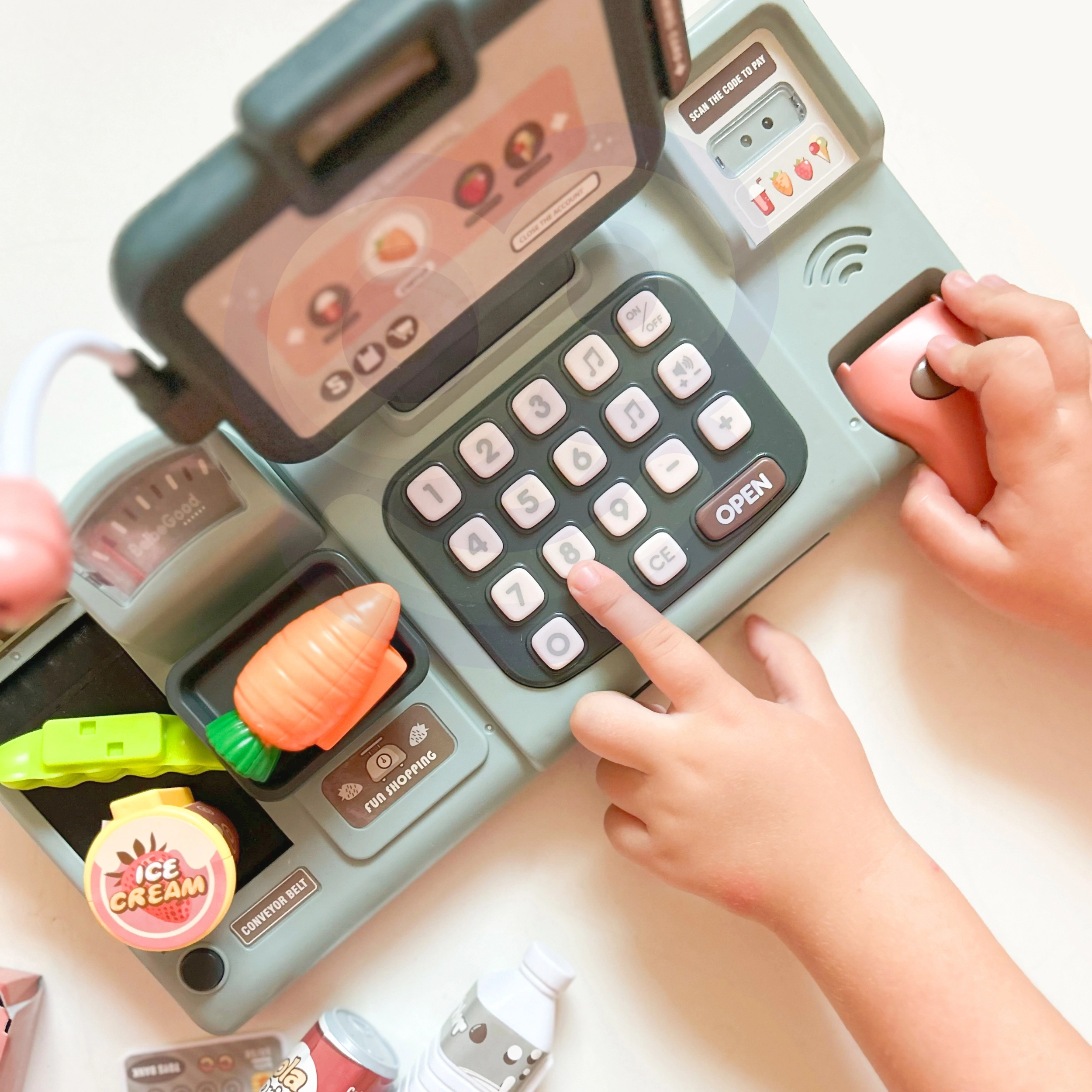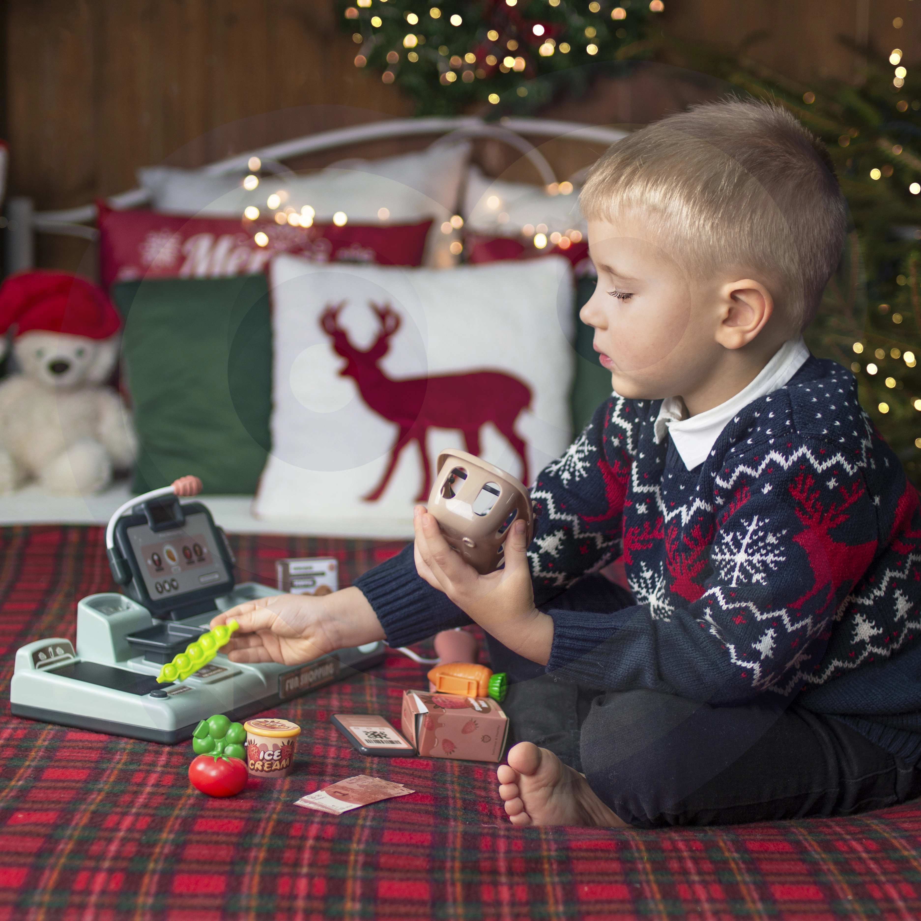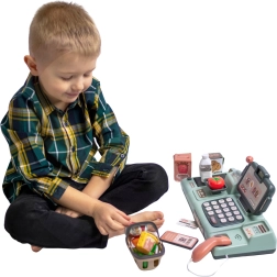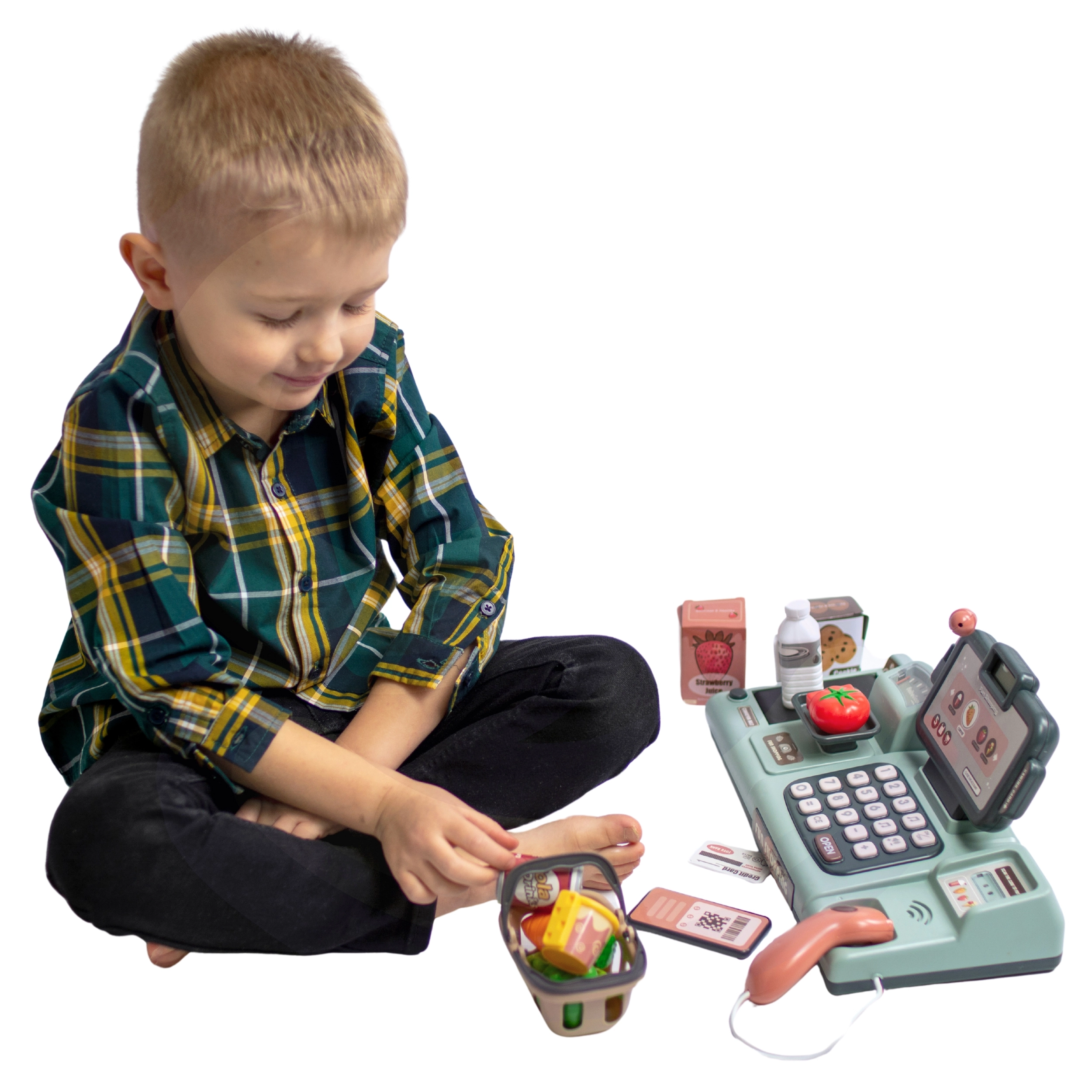 Касата включва терминал, благодарение на който детето може да извършва плащания в брой, с карта или със смартфон, точно както възрастните в магазина. Интегрираната везна и подвижната лента позволяват на детето да подрежда покупките и да влезе в истинската роля на продавач.