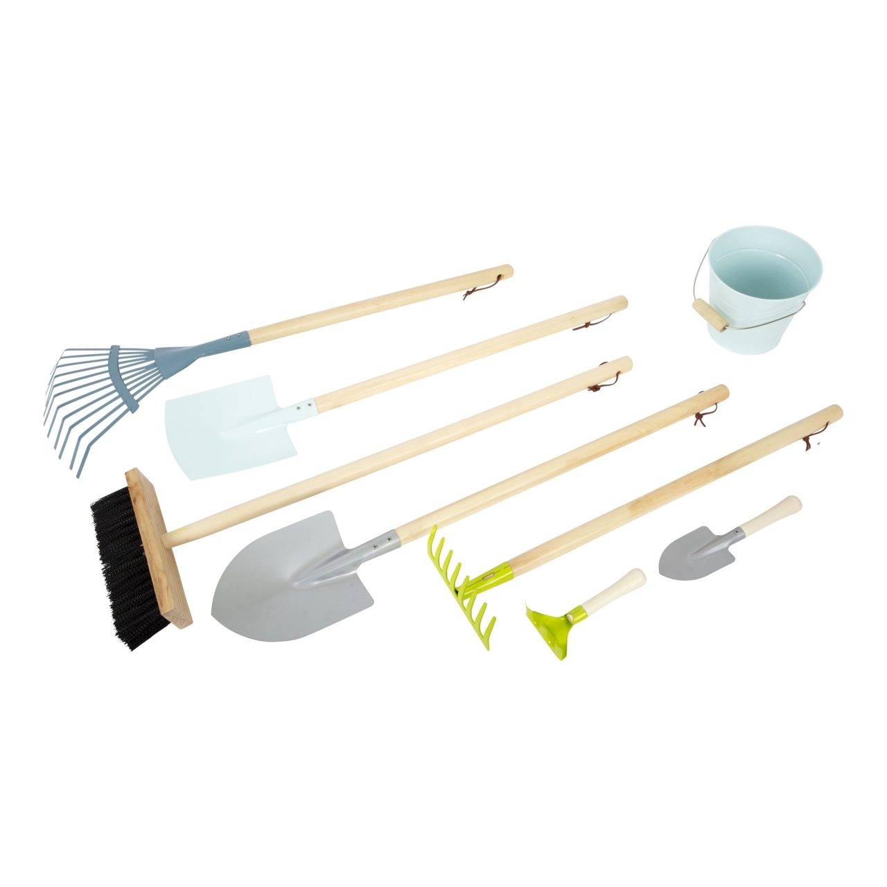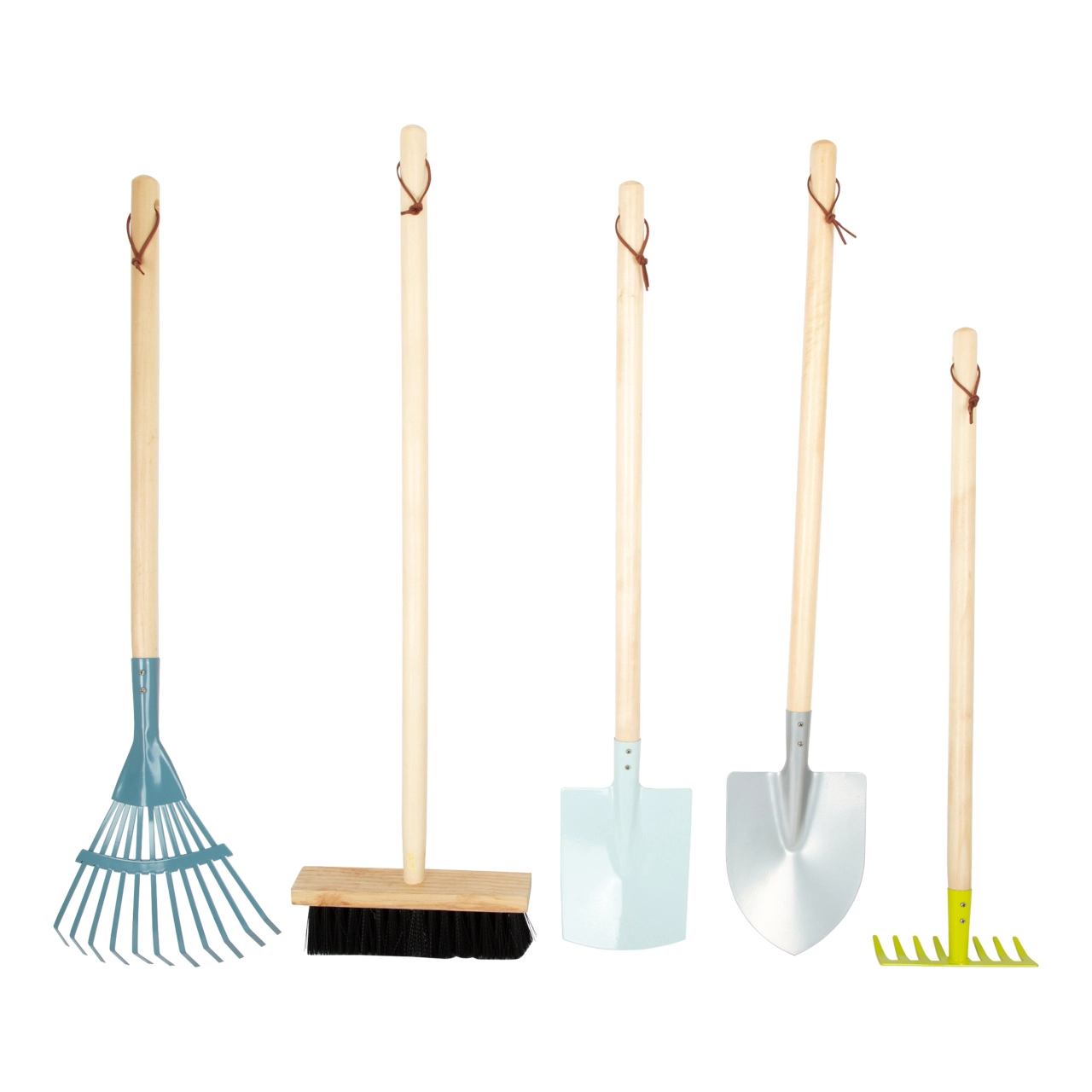 Дървените дръжки и металните работни части издържат на ежедневна детска употреба в градината, на пясъчника и във двора.