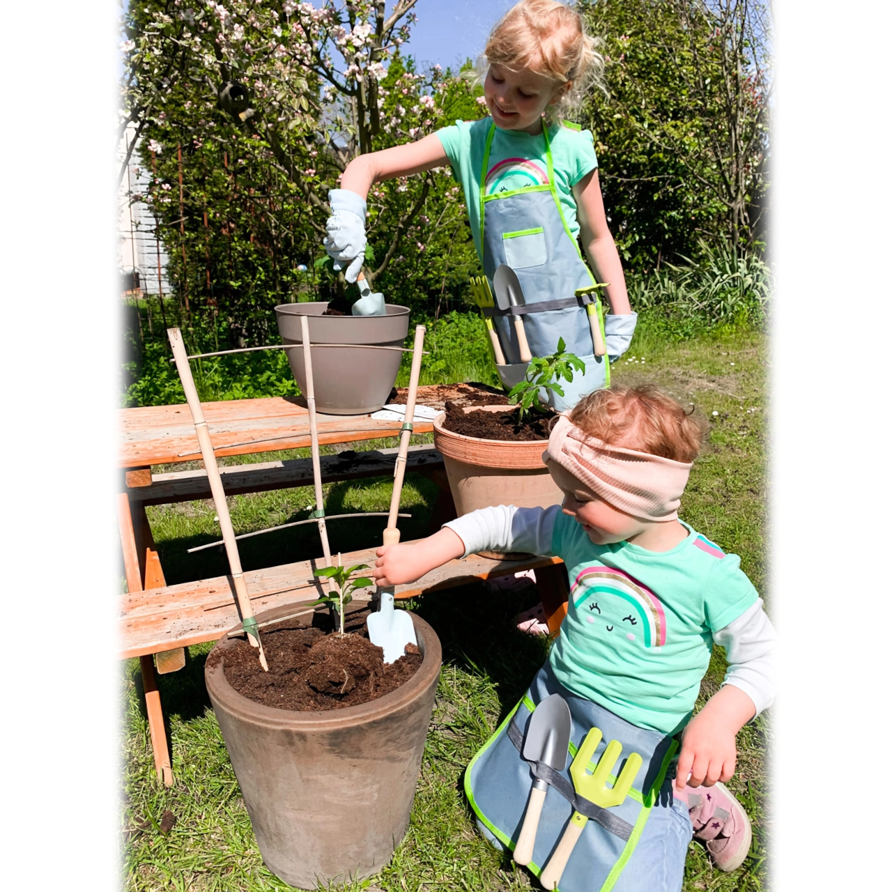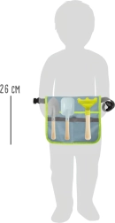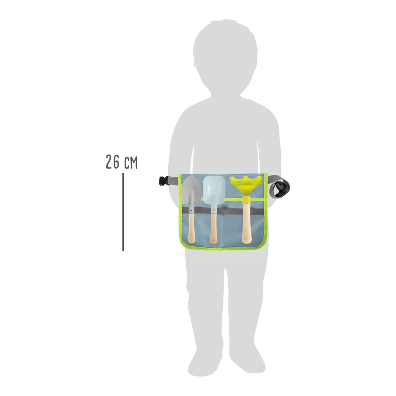 Този умел комплект комбинира удобна чантичка за кръста с практични инструменти, за да могат децата лесно да садят, разрохкват и пренасят пръст. Металните инструменти с гладки ръбове и дървените дръжки са пригодени за малки ръце и издържат на ентусиазираното детско темпо. Чантичката с регулируем колан държи инструментите под ръка и позволява свободно, безопасно движение.