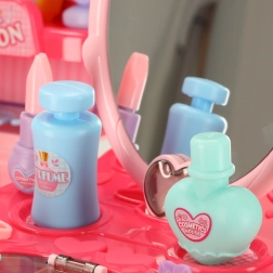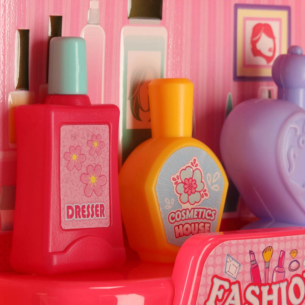 - Богат комплект аксесоари: огледалце, гребен, детски „сешоар“, фиби, пръстени, гривни, стикери и шишенца, имитиращи лак за нокти и парфюми.
