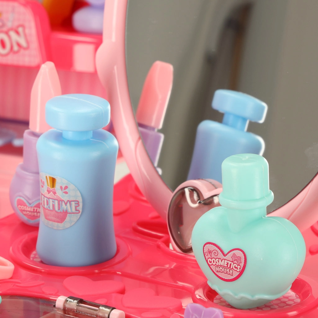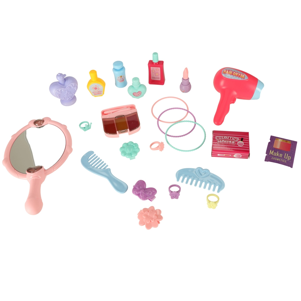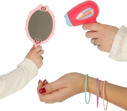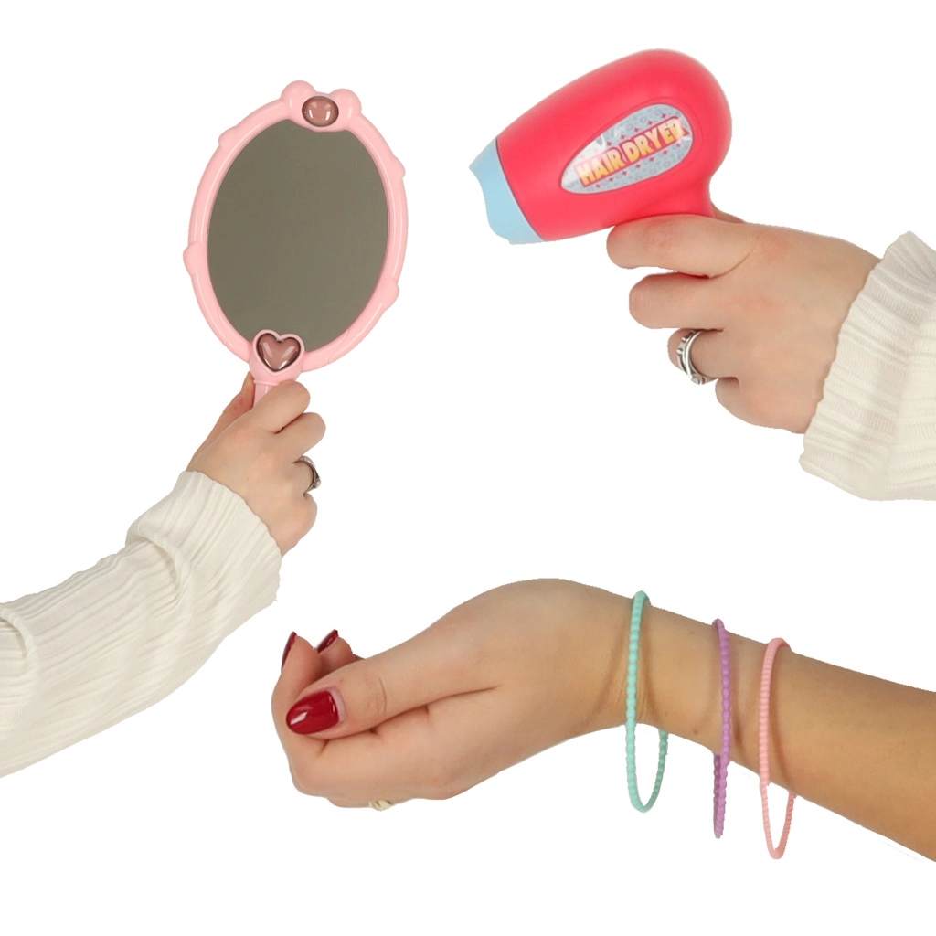 Детският пластмасов сешоар и сладкото огледалце стимулират въображението и придават на играта автентично преживяване – безопасно и без истинска козметика.