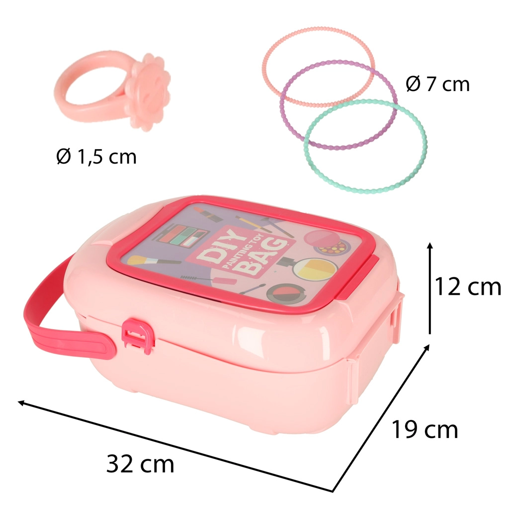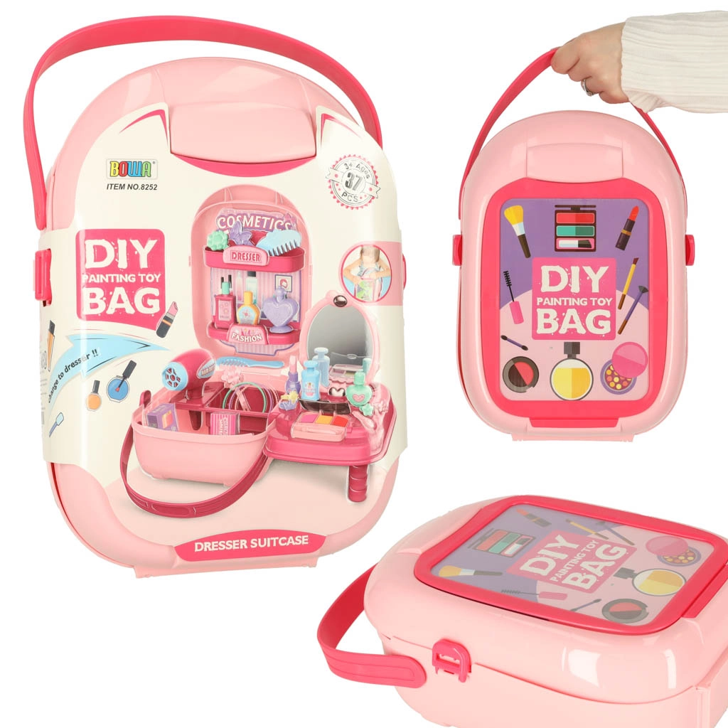 Козметичен комплект в преносим куфар за малки кокетки и бъдещи фризьори предлага много аксесоари за креативна игра: сешоар, гребен, огледалце, фиби, пръстени, гривни и цветни шишенца. Куфарът има прозорче за персонализация – поставете снимка или името на детето и създайте уникален комплект за ролеви игри. Чудесен за развитие на фината моторика и социалните умения. Не съдържа истинска козметика.