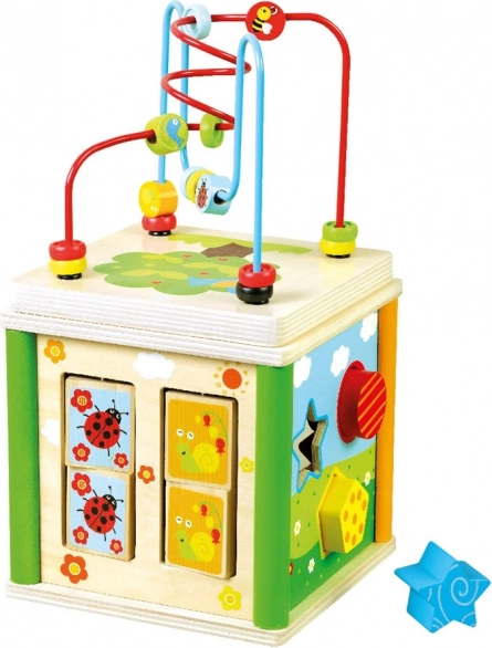 Благодарение на различните активности децата по игрален начин упражняват логическо разсъждение, концентрация и креативност. Кубчето е изработено от издръжливо дърво и допълнено с елементи от метал, така че издържа на ежедневните детски открития.