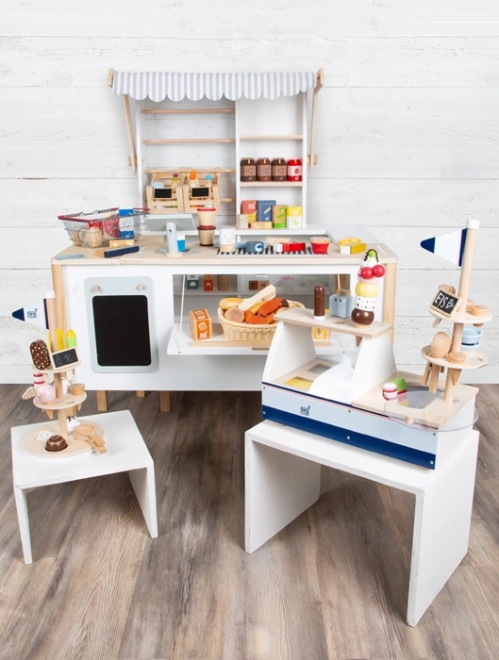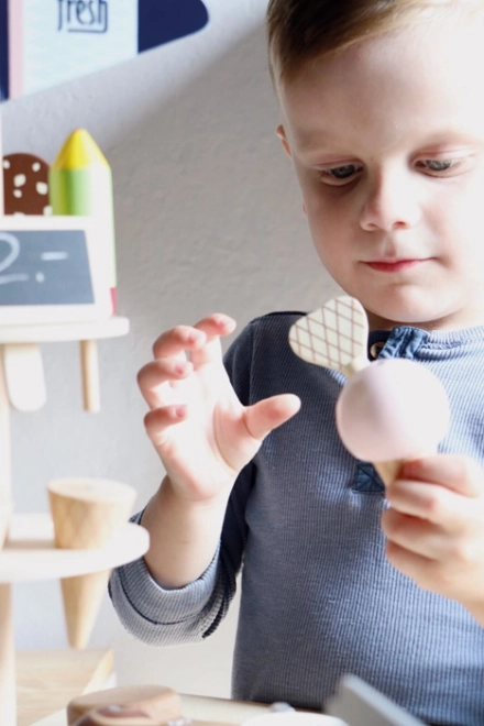 Дървената стойка за сладолед Fresh е перфектна играчка за малки продавачи. Предлага разнообразни сладоледени лакомства и магнитна лъжичка, която гарантира безопасна и лесна работа. С естествения си вид насърчава въображаема игра.