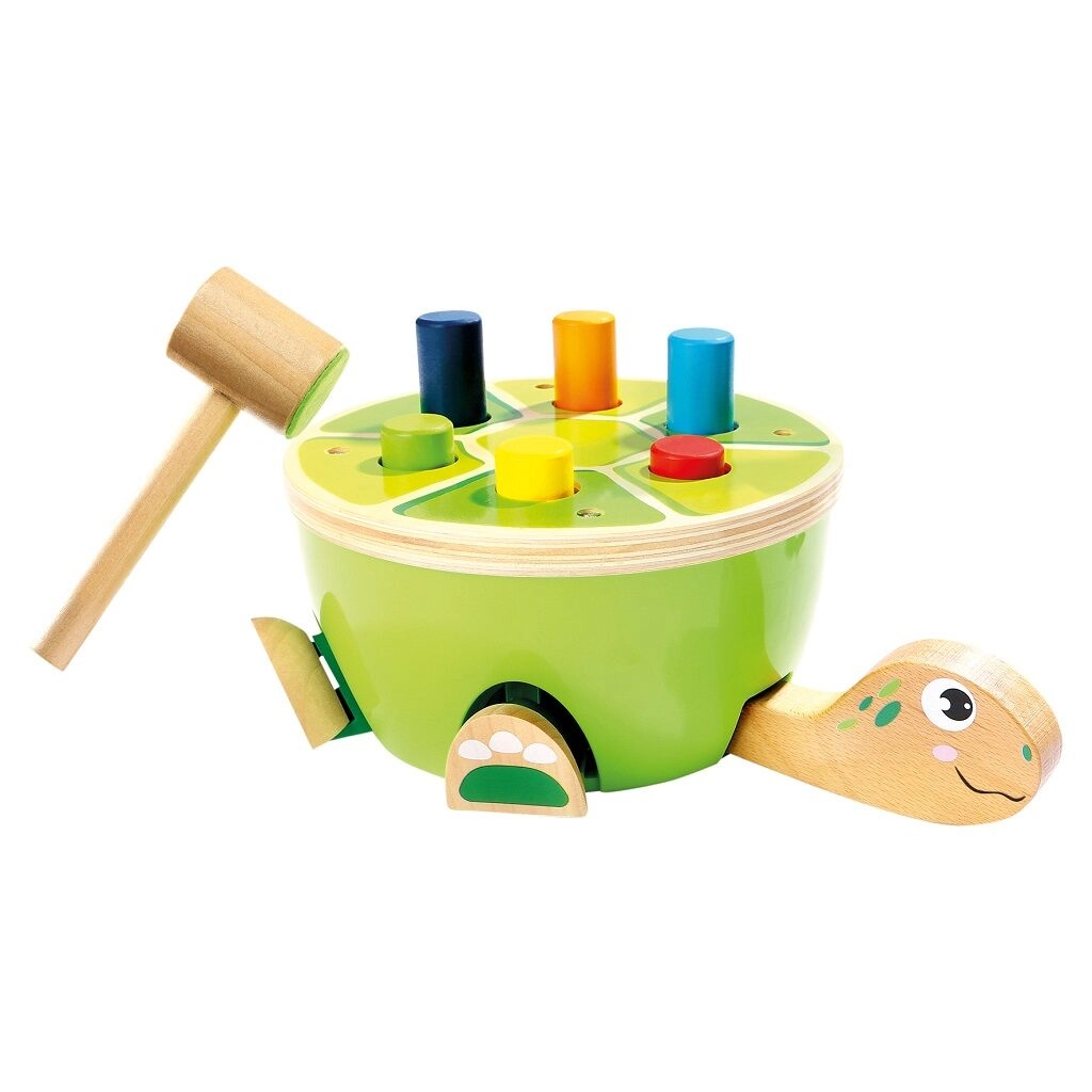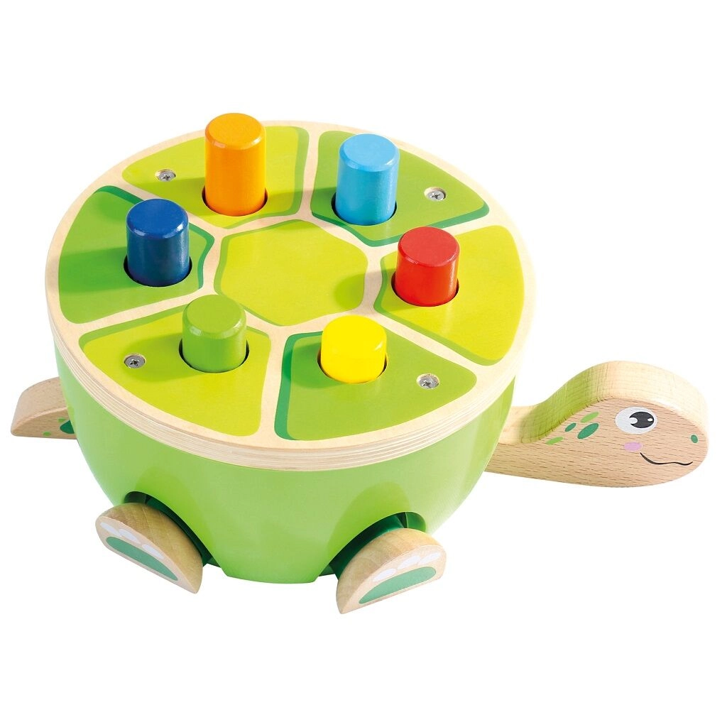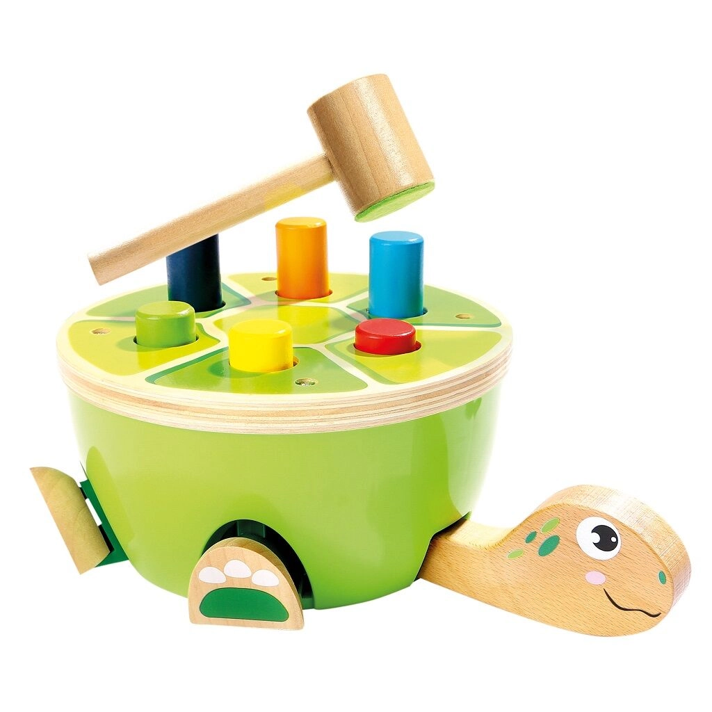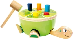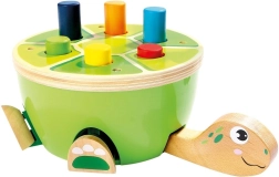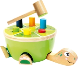 Забавна дървена чукалка във формата на костенурка, която развива детската финa моторика, координация ръка–око и концентрация. Цветните колчета се набиват в черупката с помощта на чукче с филцов покрив за по-тиха игра, при което на костенурката „оживяват“ крачетата и главата – чудесен начин да се подкрепи любознателността и радостта от откриването.