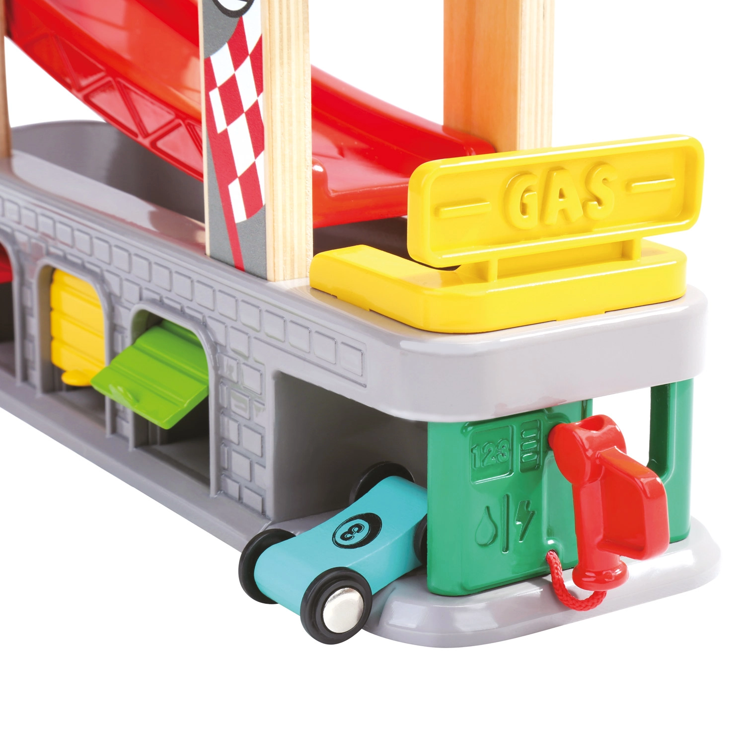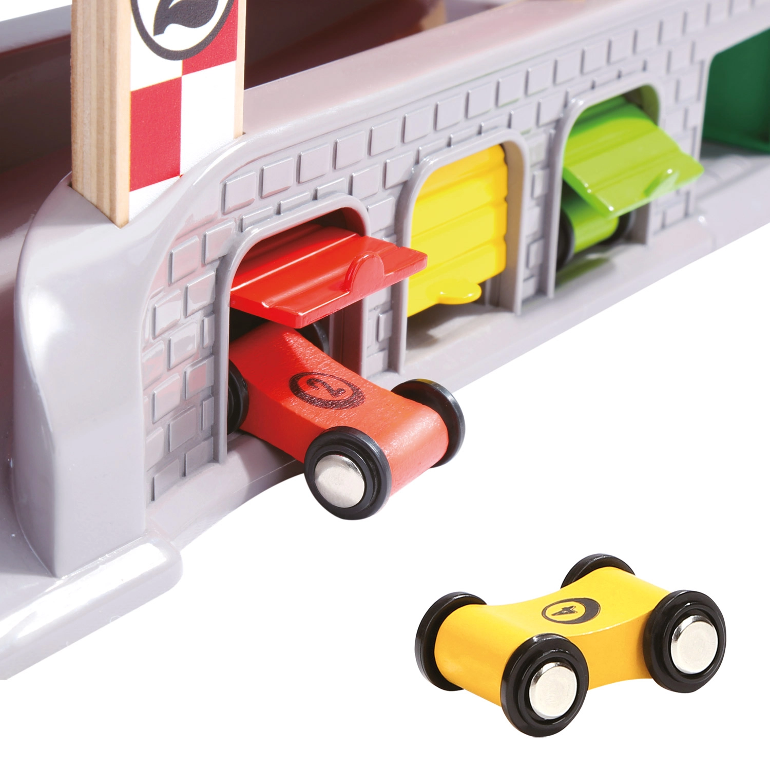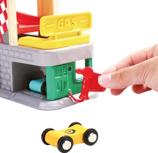 Три гаража с отваряеми вратички и станция за зареждане насърчават въображаеми сценарии – от сервизна спирка до паркиране и сортиране на коли.
