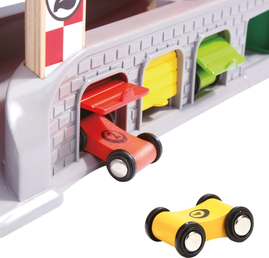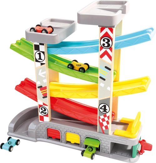 Стабилната конструкция от издръжливи материали издържа на ежедневна игра, а практичните гаражи служат и за съхранение и пренасяне на количките. Ярките цветове и номерираните нива помагат за разпознаване на цветовете и основно броене. В комплекта има четири колички с плавно движение за мигновени състезания.