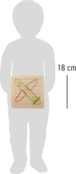 Дървената дъска Геоплан е оборудвана с 64 равномерно разположени колчета върху здрава дървена основа с размери 18 x 18 x 2 cm. Благодарение на 48 цветни ластика децата могат да създават безкрайно разнообразие от шарки и фигури – от прости геометрични форми до сложни композиции. Комплектът включва и 23 картончета с образци, които помагат за упражняване на пространствено планиране и логическо мислене.