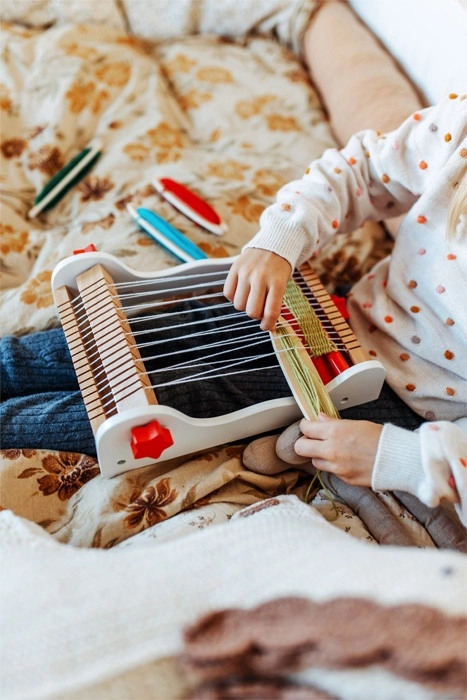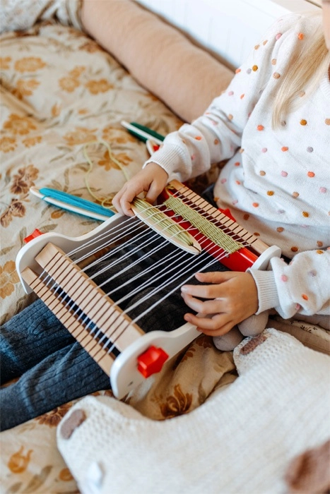 Компактната настолна конструкция с ясно водене на основата и лесно промушване на вътъка улеснява децата да разберат основите на тъкането още от първия опит.